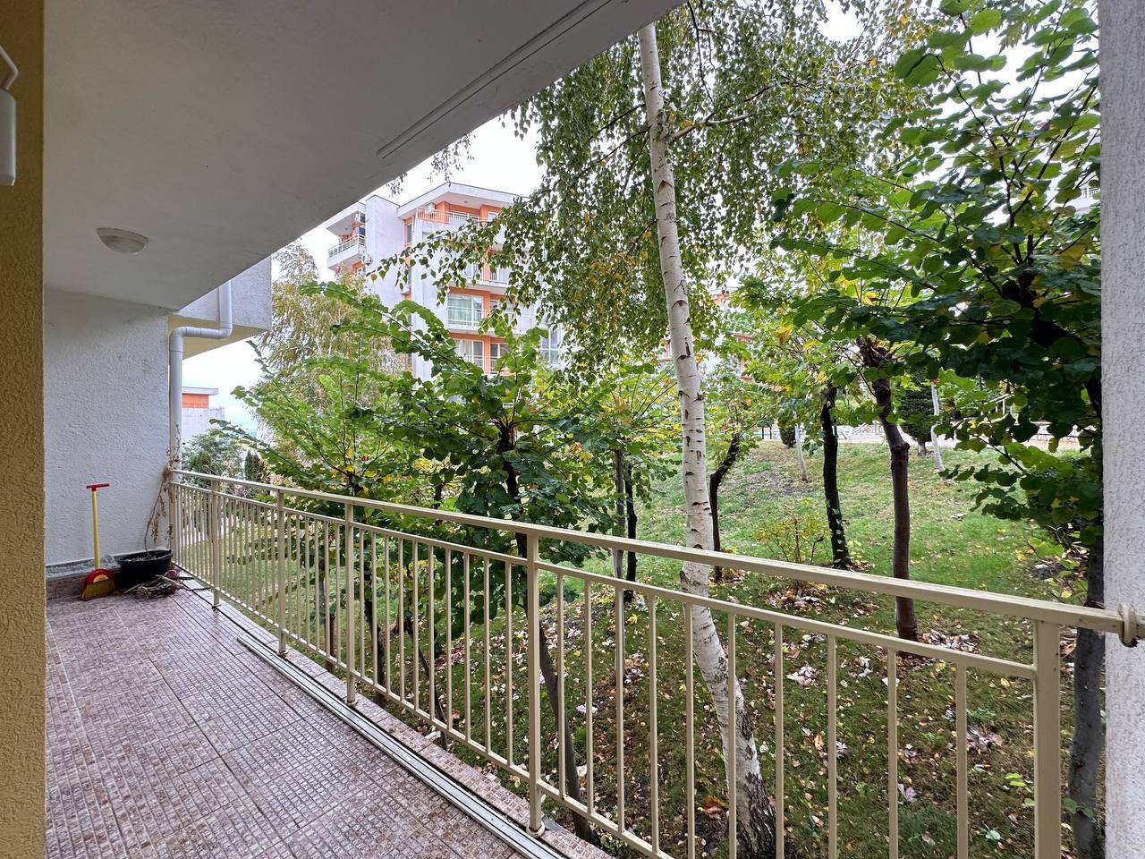 • Layout: Entrance hall, spacious living room with separate kitchen and dining area, bedroom, bathroom, and a cozy balcony overlooking the complex