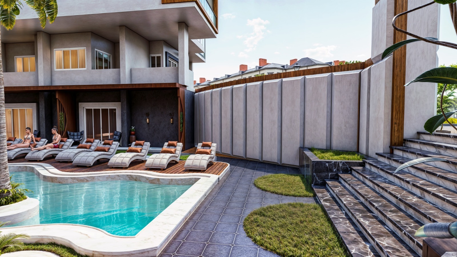 💦 Direct view of a large swimming pool gives you a permanent holiday vibe.