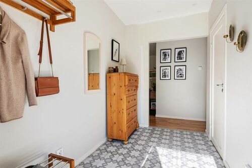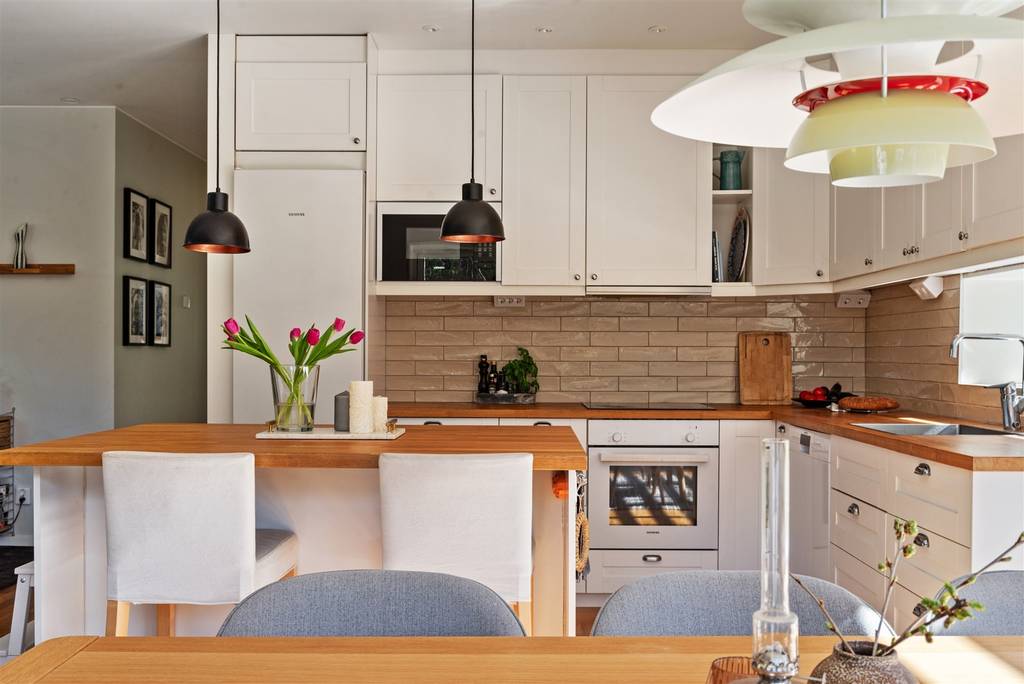 The home's interior reflects sophisticated Scandinavian minimalism. Floor-to-ceiling glass panels in the open-plan living area dissolve boundaries between inside and outside, flooding the space with natural light while framing garden views. The kitchen flows seamlessly into the living room, creating a social hub where cooking becomes part of entertaining. Modern appliances and generous storage make meal preparation effortless, whether you're testing Swedish recipes with local ingredients or preparing familiar dishes from home.