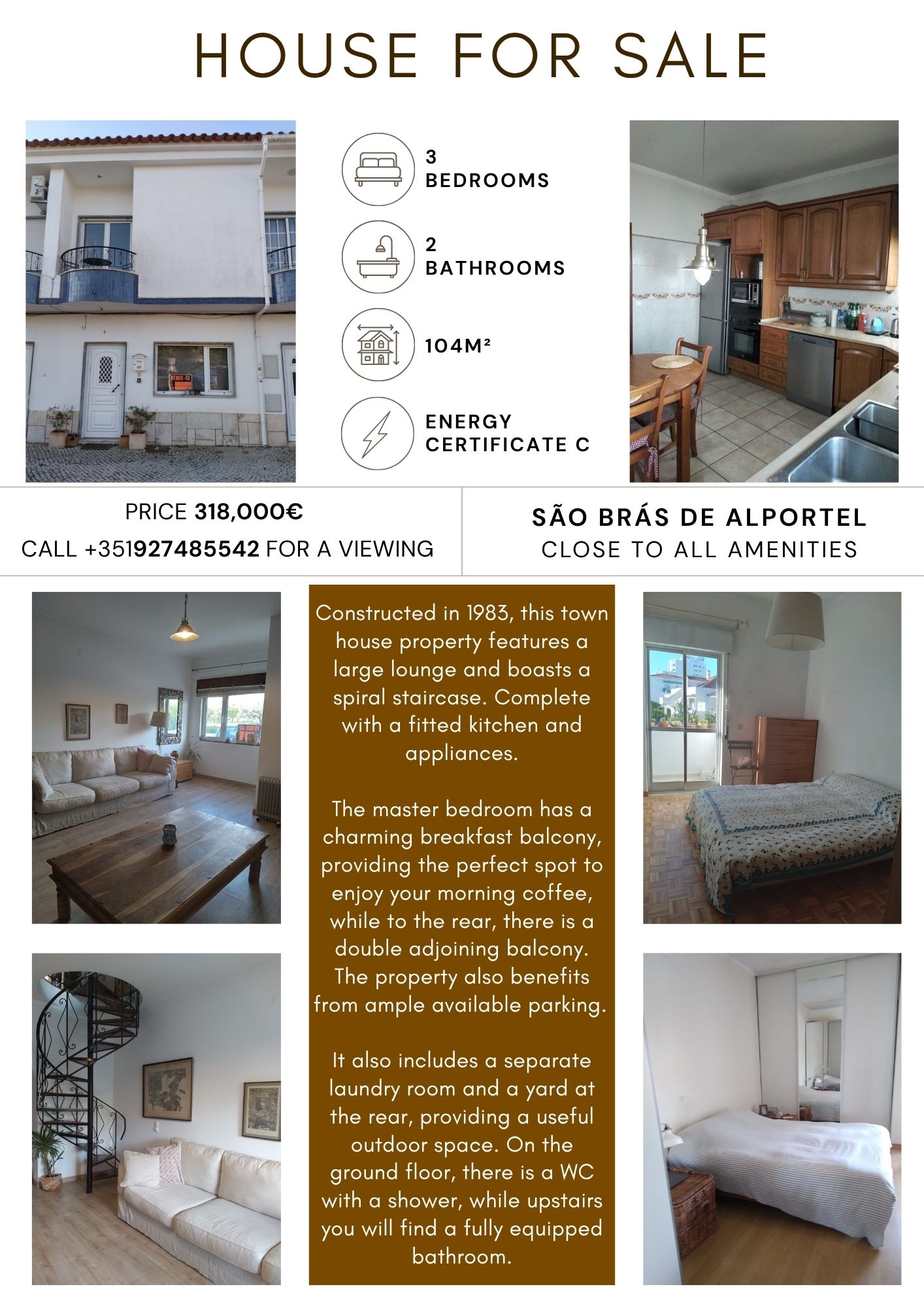 Breakfast Balcony in each bedroom,two bathrooms,fitted kitchen with appliances,small yard,laundry room,spiral staircase feature.