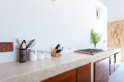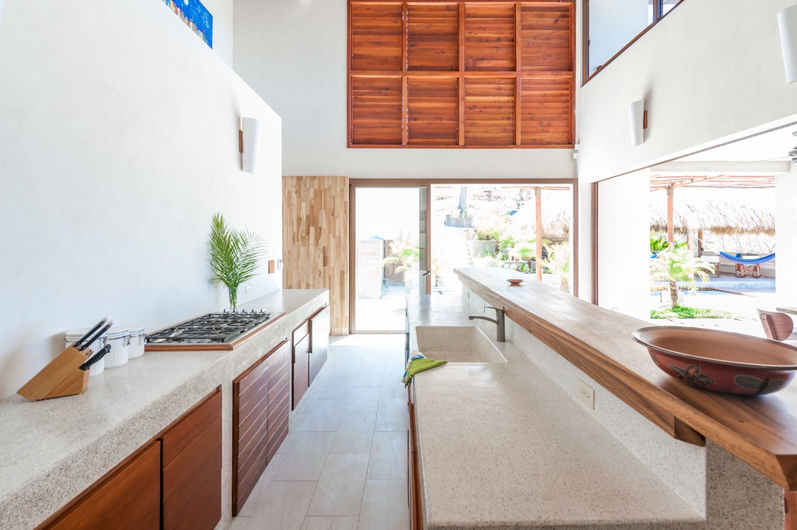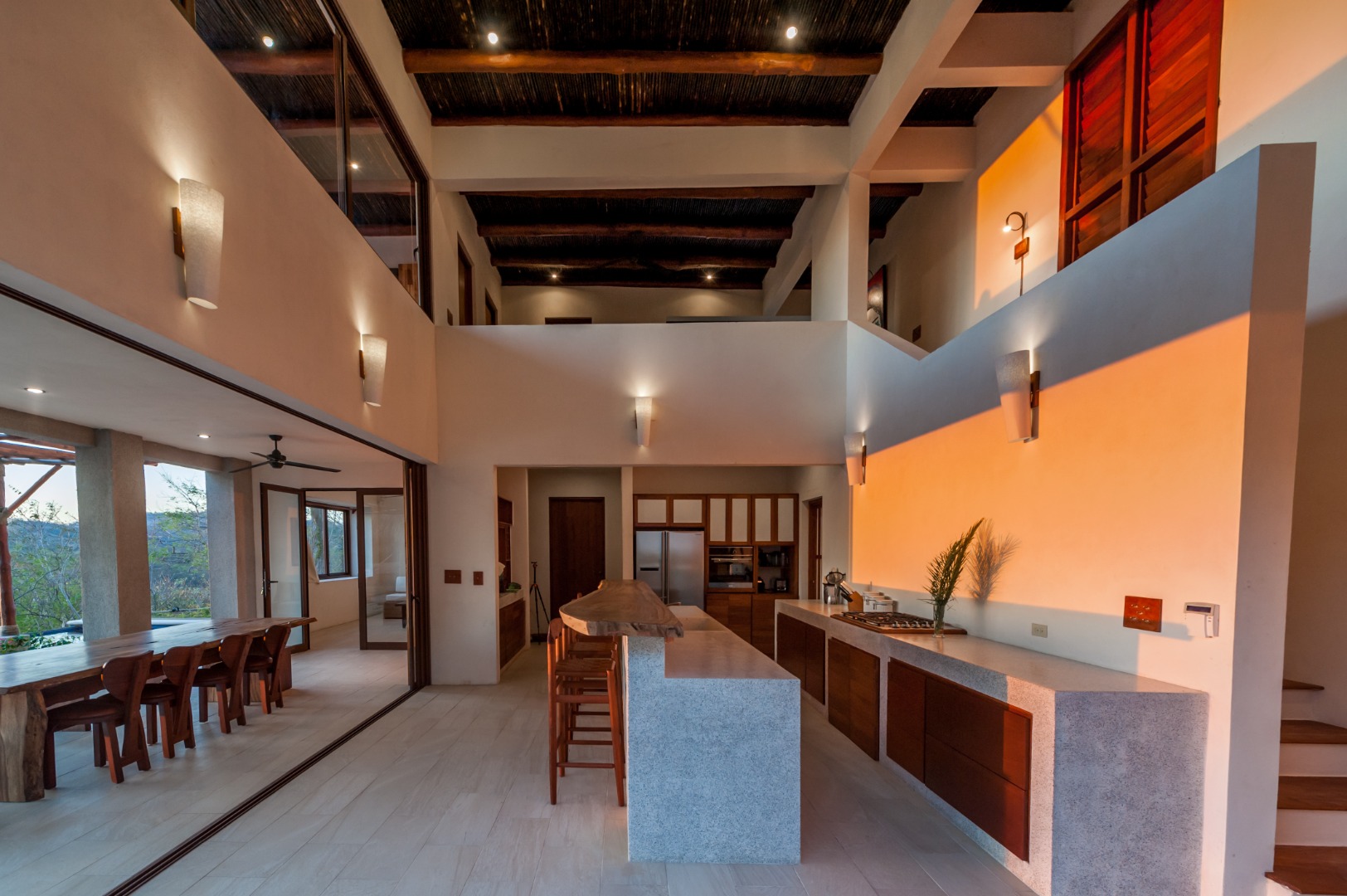 Casa Luna embraces an innovative indoor/outdoor design, with sliding kitchen walls that open onto a large terrace. The terrace is equipped with a comfortable sitting and dining area, offering breathtaking views of the ocean and surrounding jungle. The well-appointed kitchen makes meal preparation a delight, featuring a gas stove, dishwasher, microwave, and ample counter space. An outdoor North American grill is perfect for al-fresco dining under the stars.