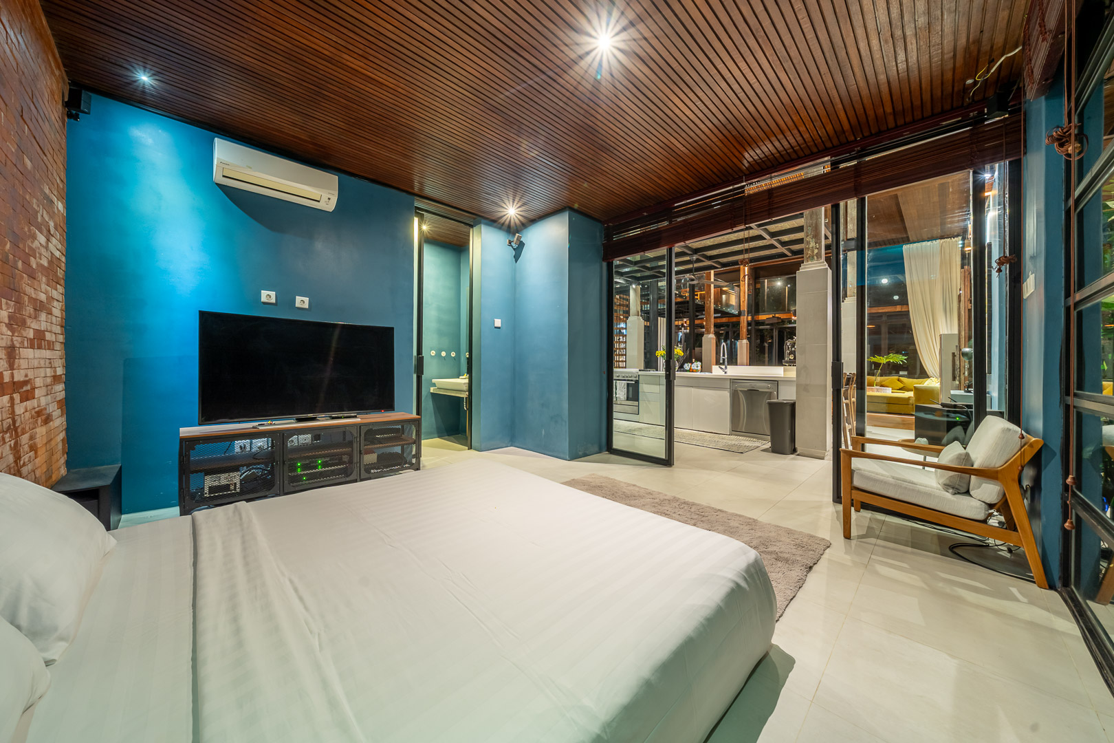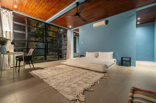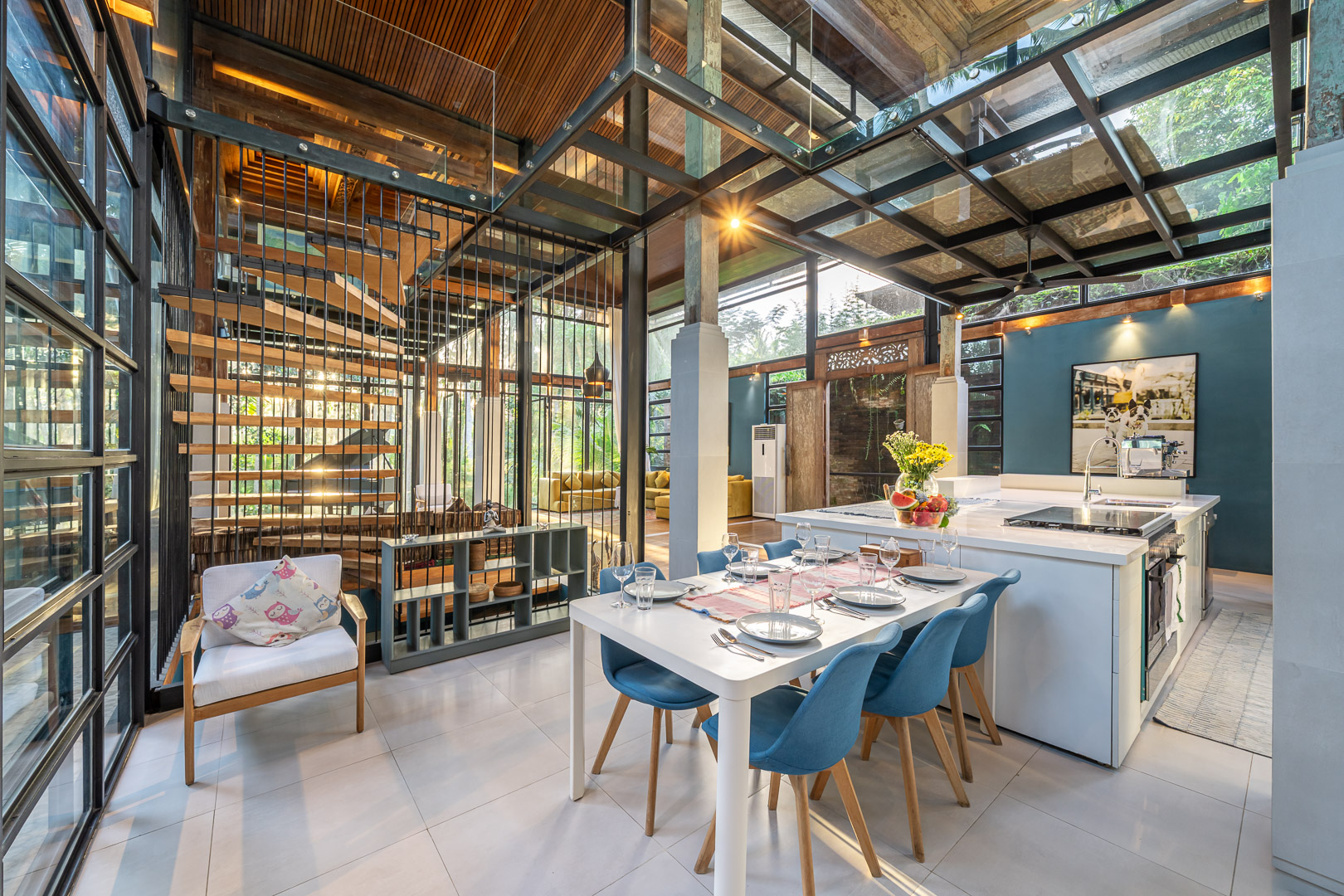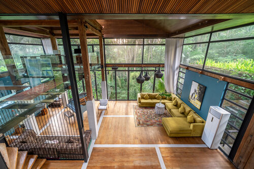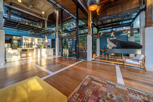 Fully renovated in 2021, it offers jungle and river views, a 12.4m private pool, glass mezzanine, reclaimed teak wood floors, and curated interiors.
