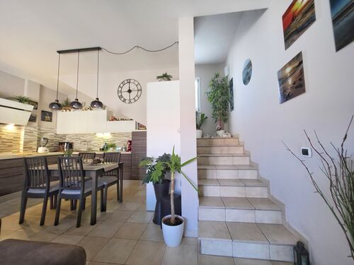 Access to the property, shared with only one other unit, guarantees privacy and tranquility. A comfortable staircase leads to the second and final floor, opening up to a world of light and design.