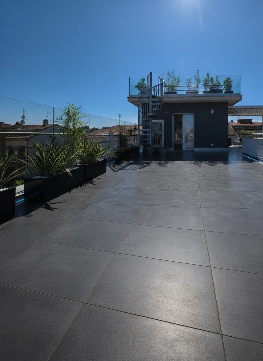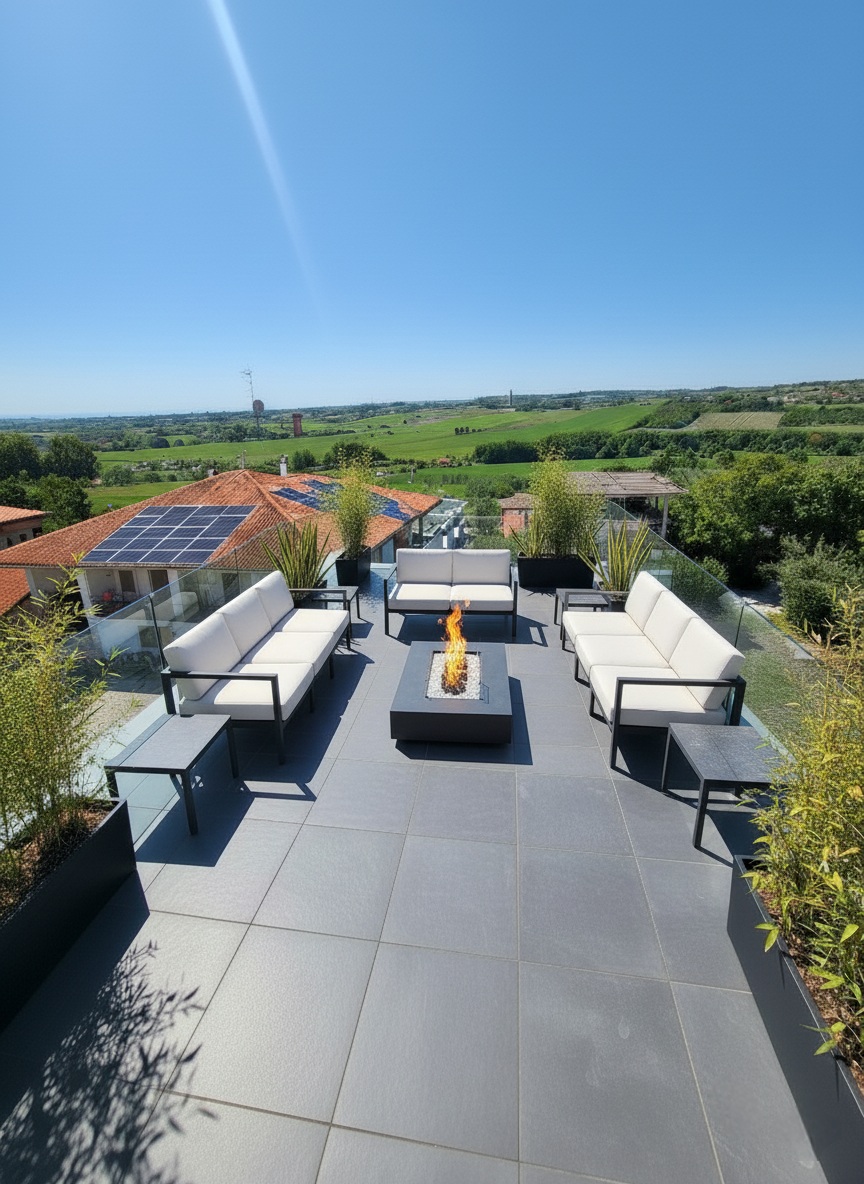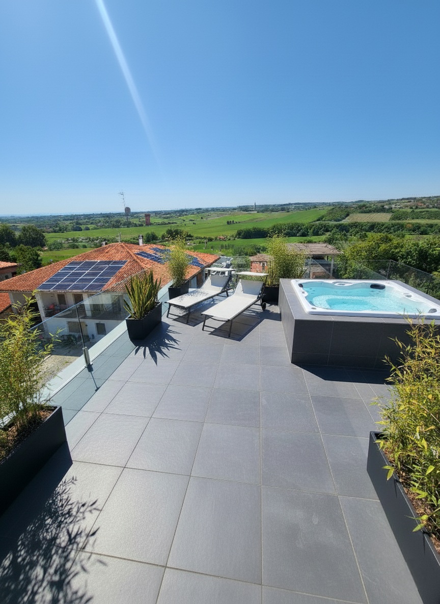 The true heart of this residence is its outdoor space. The master bedroom opens onto a first magnificent terrace of 130 sqm. A charming spiral staircase then leads up to the second rooftop terrace of 40 sqm—a privileged vantage point with a 360-degree view that sweeps from the Romagna coastline over the Sangiovese hills, all the way to Mount Titano in the Republic of San Marino.