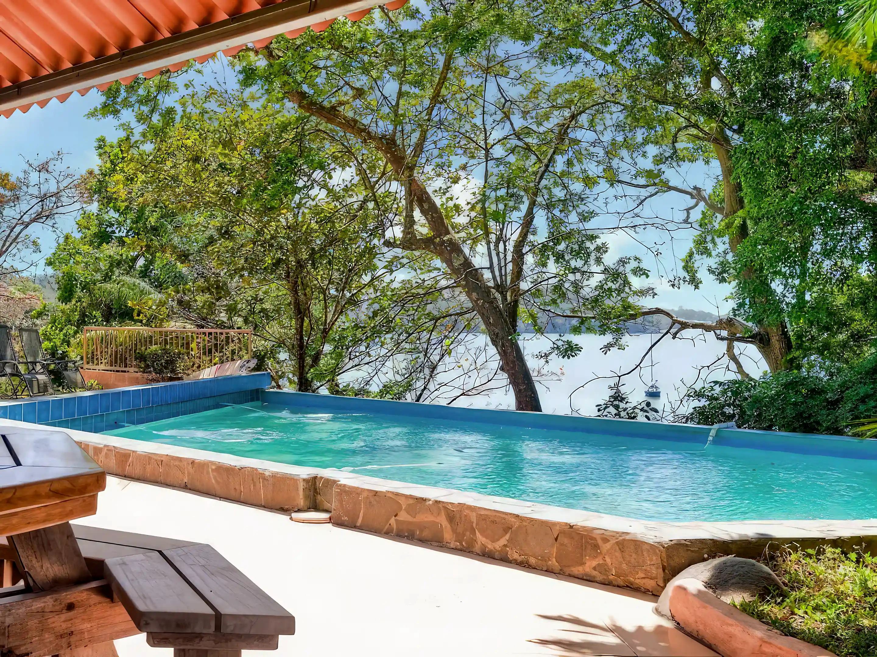 The bar/dining area has a breathtaking ocean view, overlooking lush vegetation and a vanishing edge swimming pool. The kitchen is well equipped with commercial equipment and an open design. It has had many photos taken of it by envious guests.