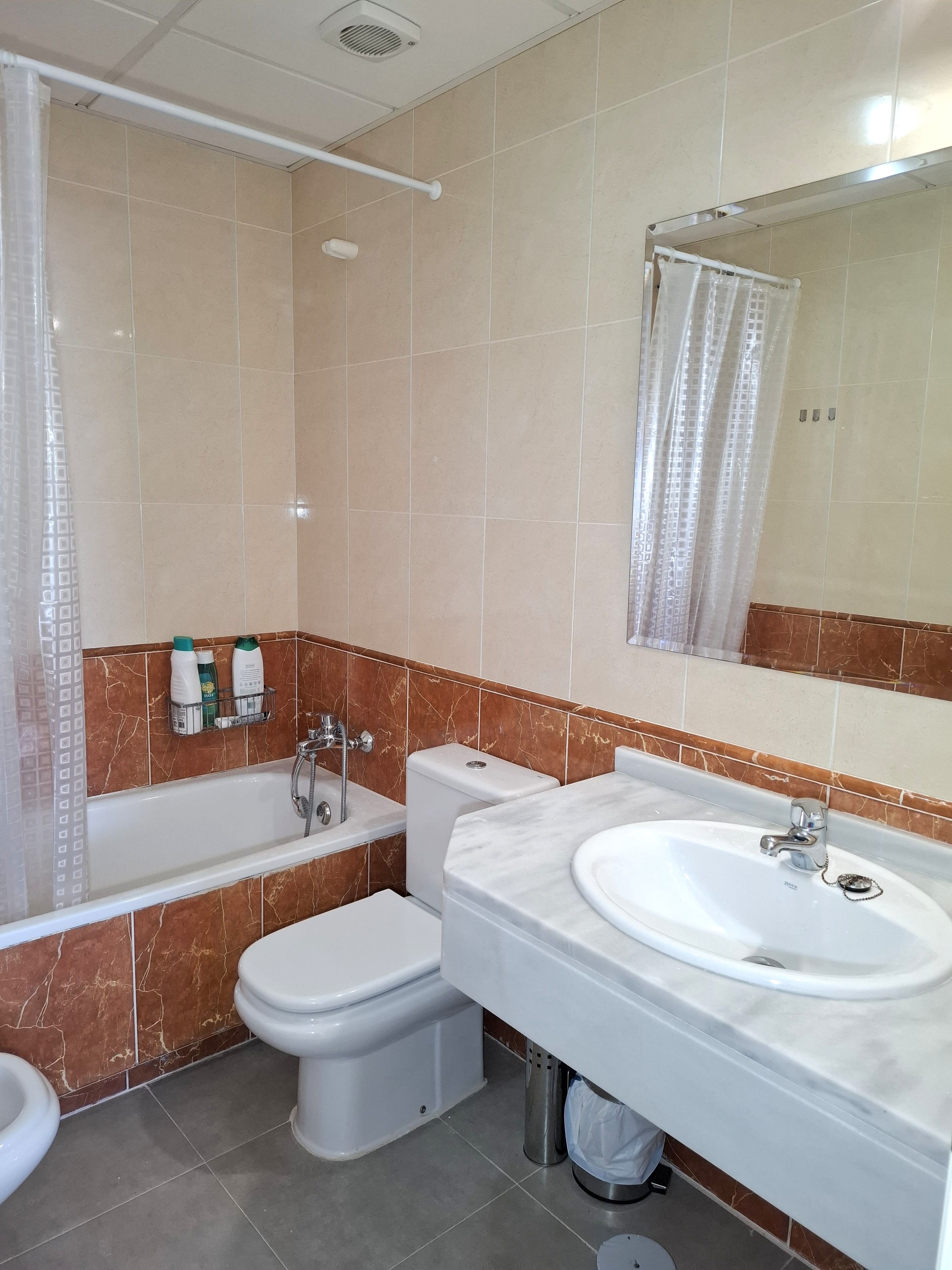 Hacia la izquierda encontramos un amplio dormitorio con un gran armario empotrado que además cuenta con un baño en suite equipado con bañera. Dispone de ventana con vistas y aire acondicionado.