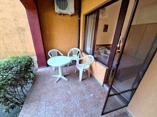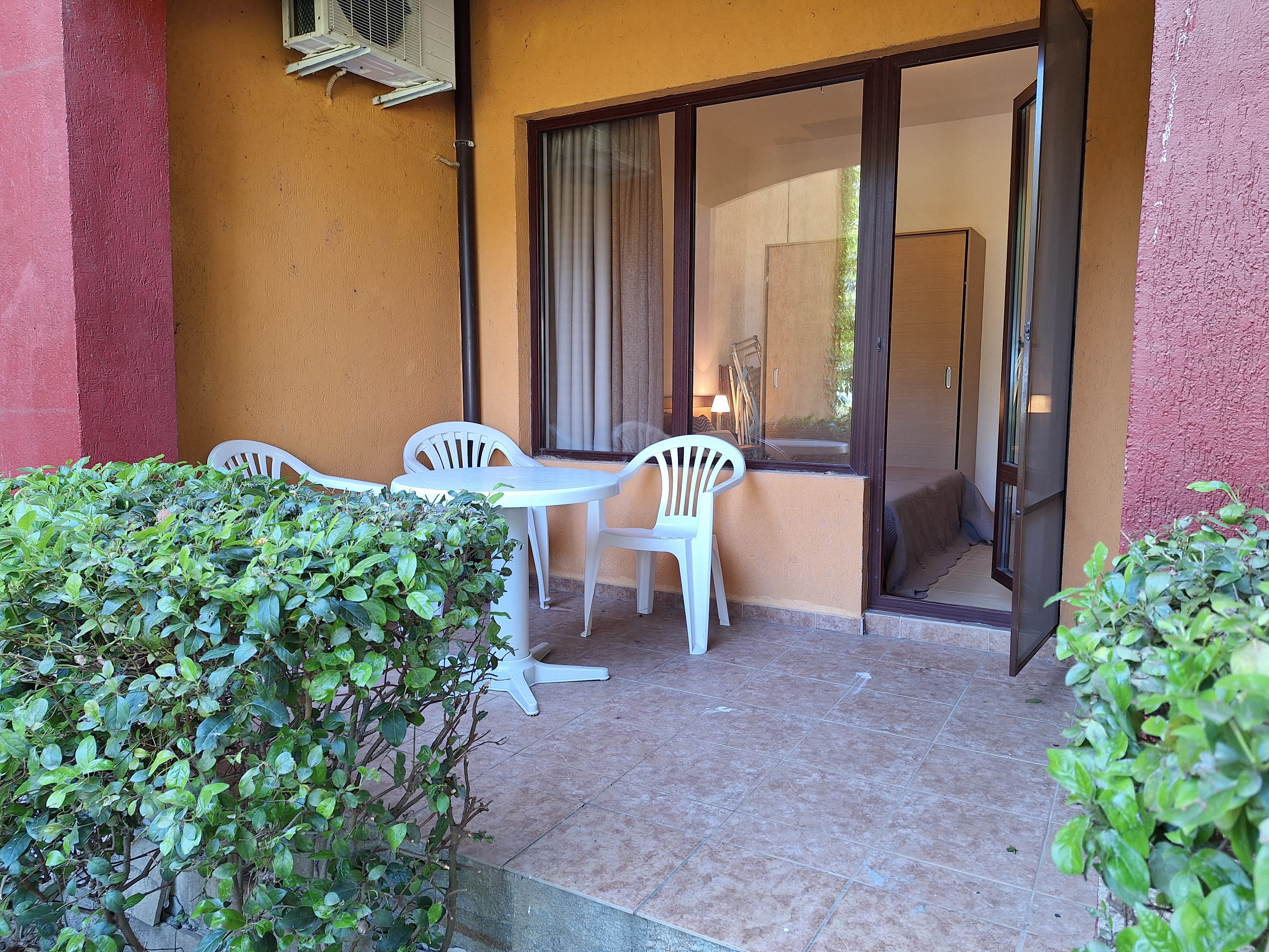 The property offers a bright living room with kitchenette and dining area, 2 bedrooms, a bathroom with toilet and sink. The apartment has own beautiful veranda with Park/Sea views and access to the garden area with enough space for BBQ, sunbeds, splash pool for children, etc.