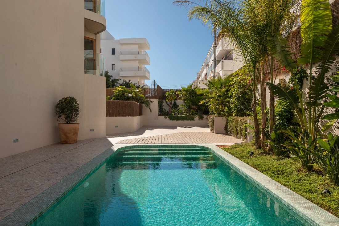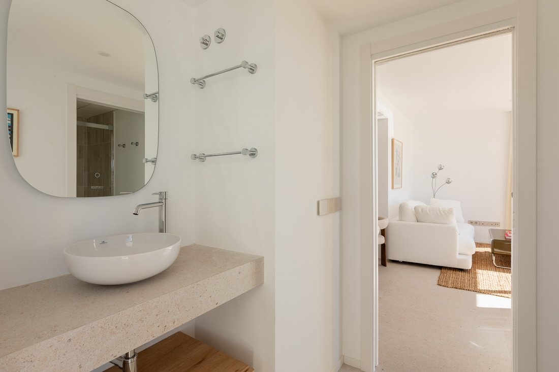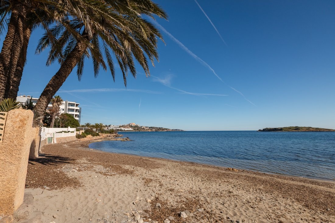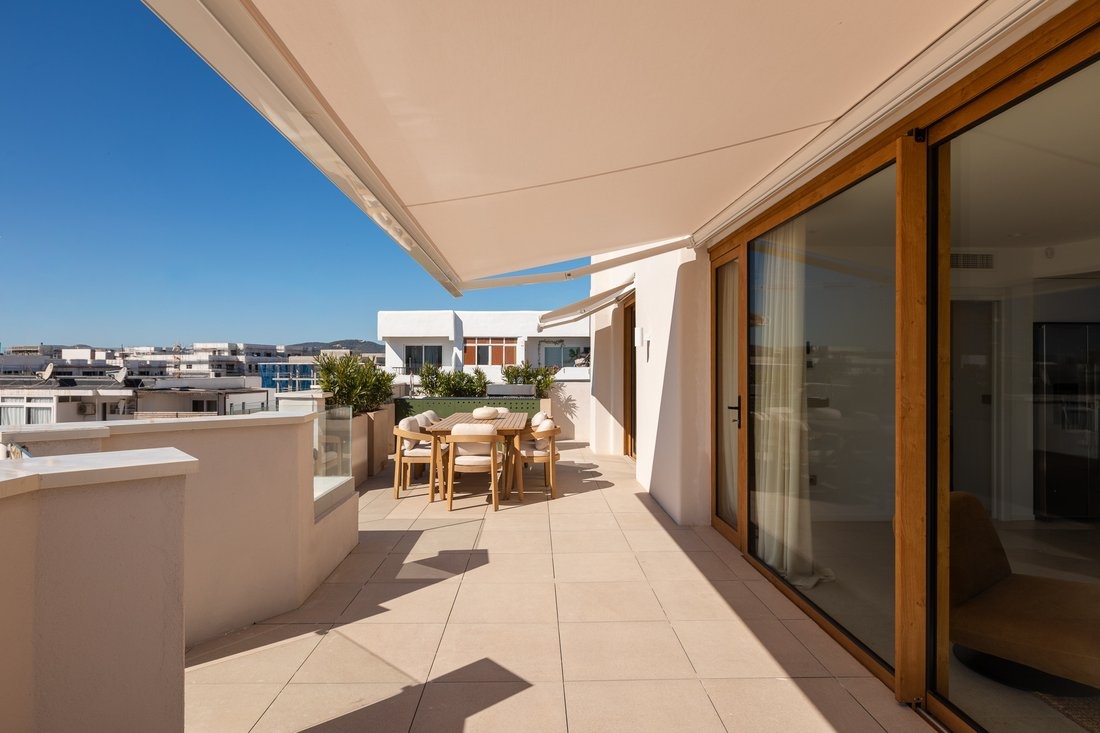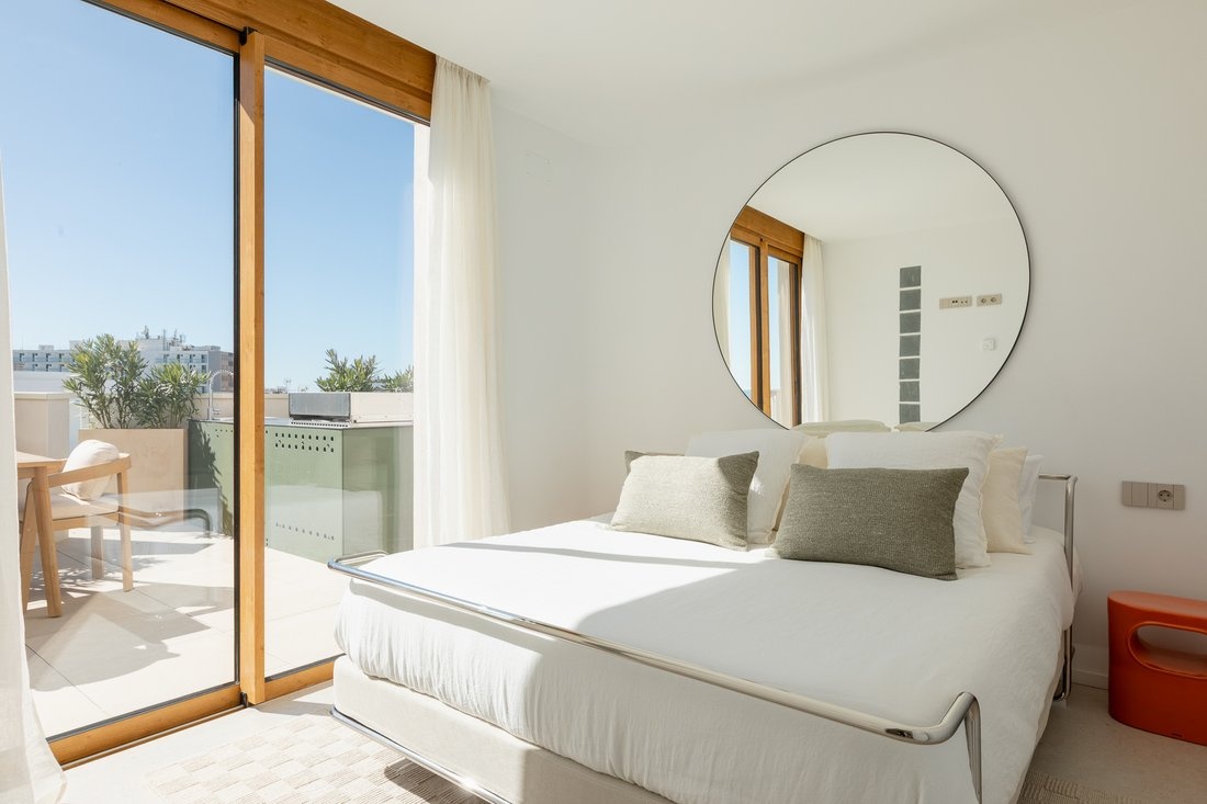 The center of Ibiza is about 10–15 minutes away, and the airport is also within close reach. The area is lively, while the building itself remains quiet, making it suitable both for year-round living and longer stays.