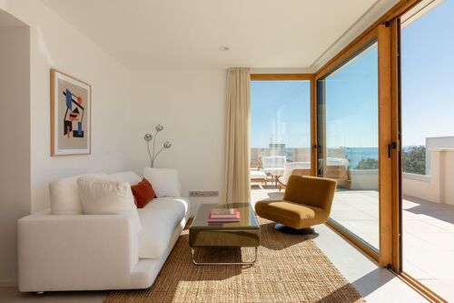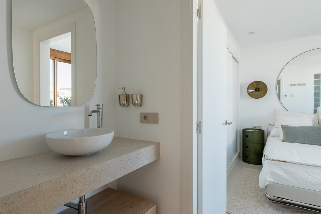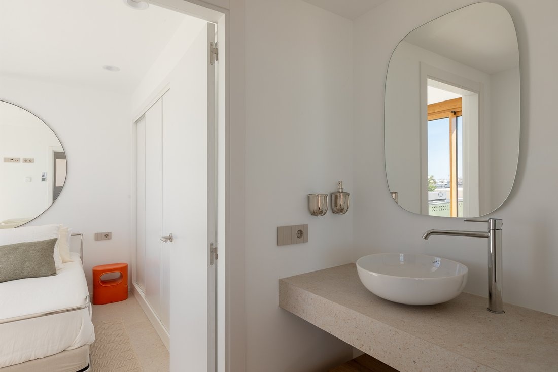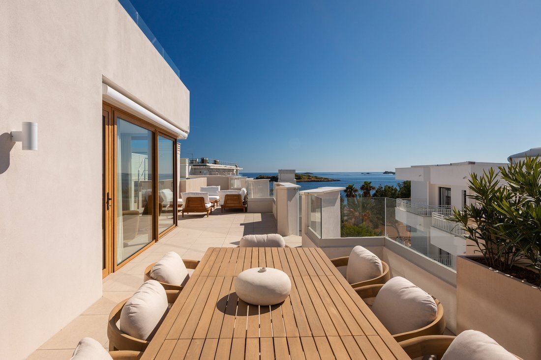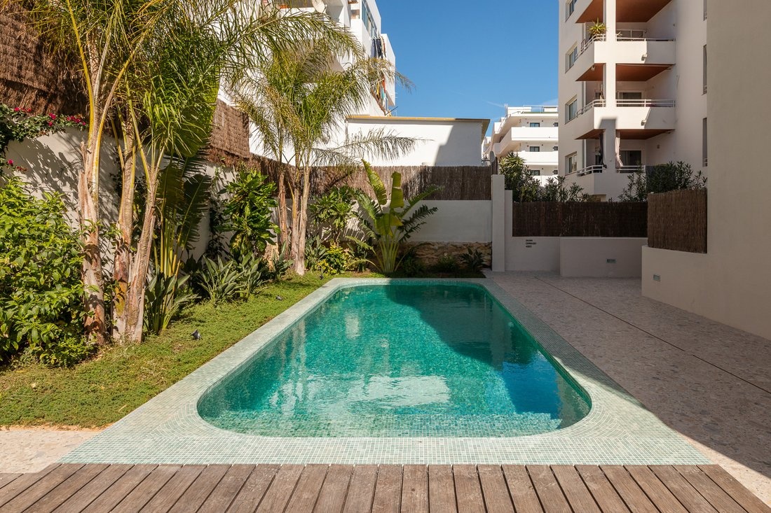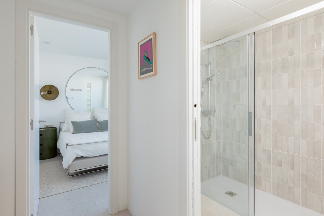 The center of Ibiza is about 10–15 minutes away, and the airport is also within close reach. The area is lively, while the building itself remains quiet, making it suitable both for year-round living and longer stays.