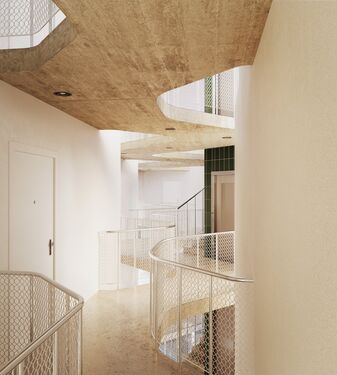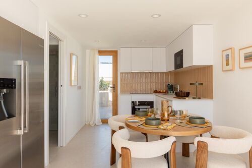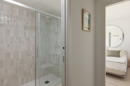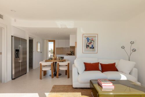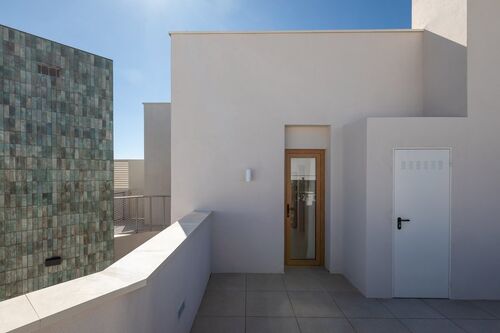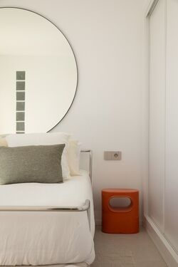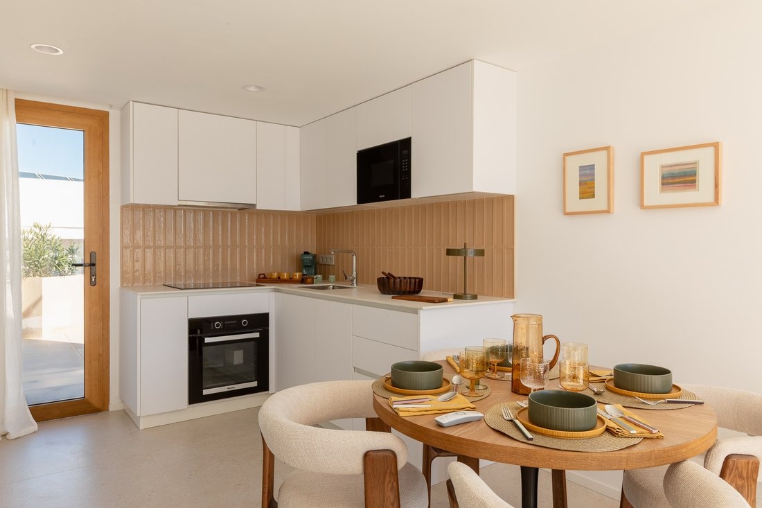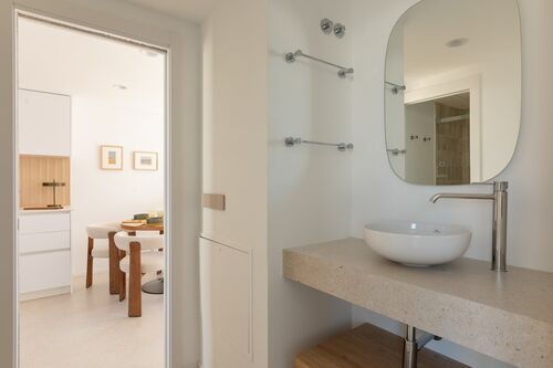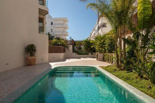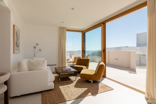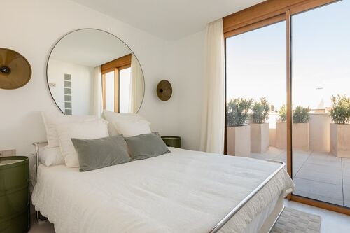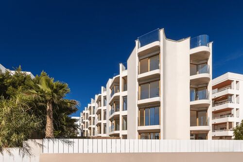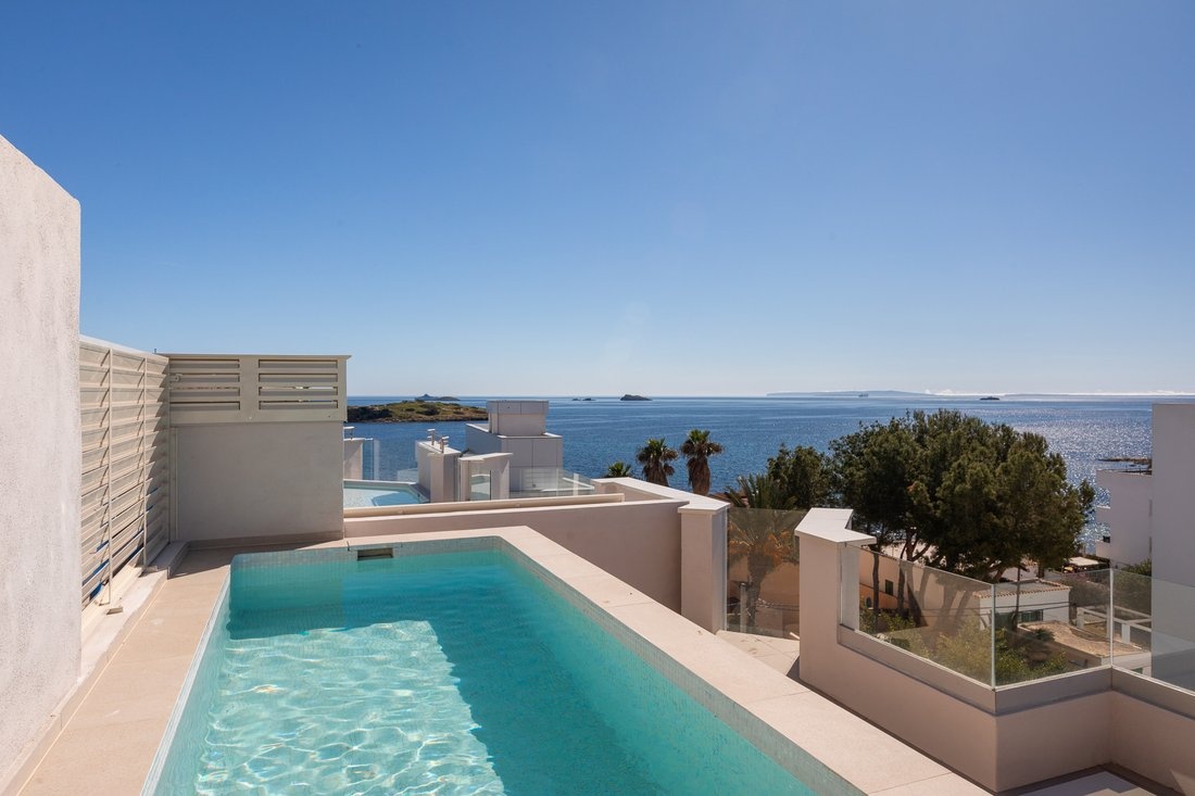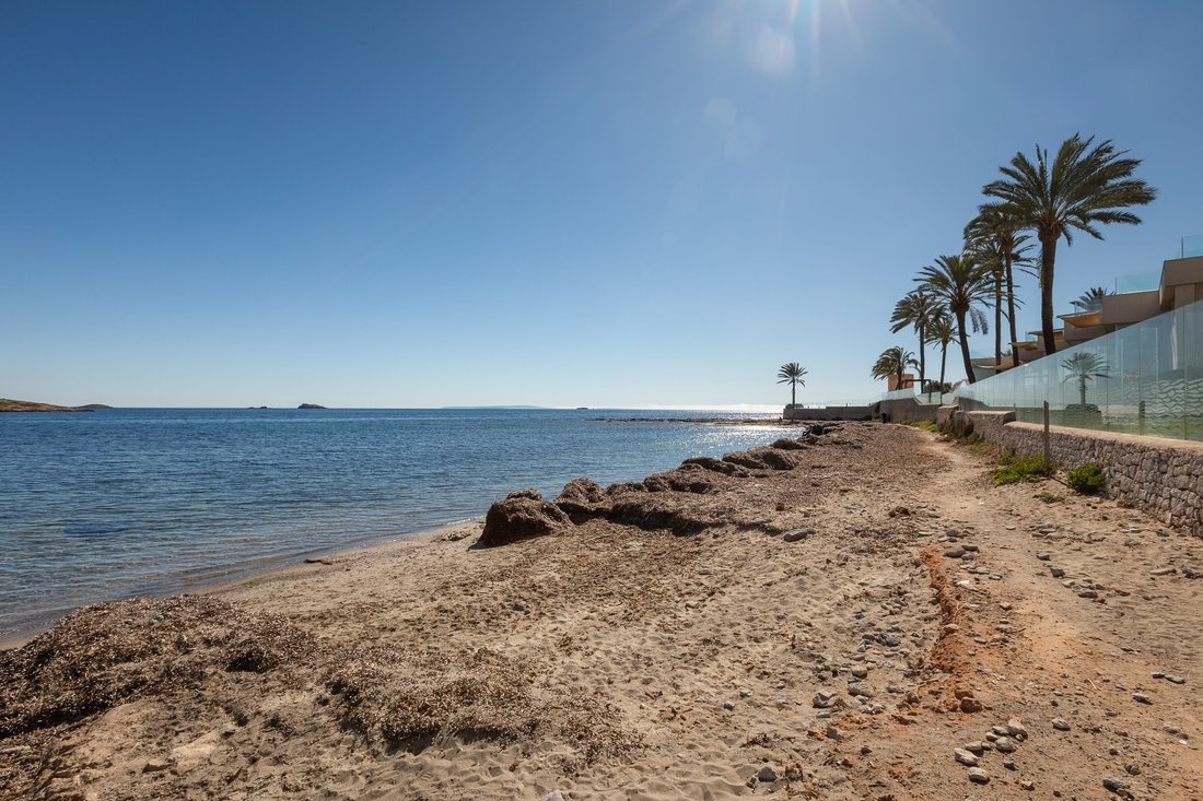 The center of Ibiza is about 10–15 minutes away, and the airport is also within close reach. The area is lively, while the building itself remains quiet, making it suitable both for year-round living and longer stays.