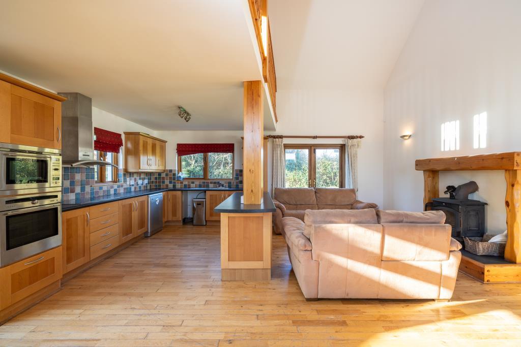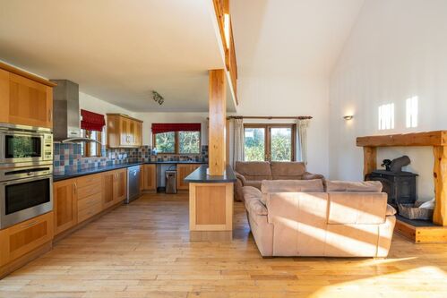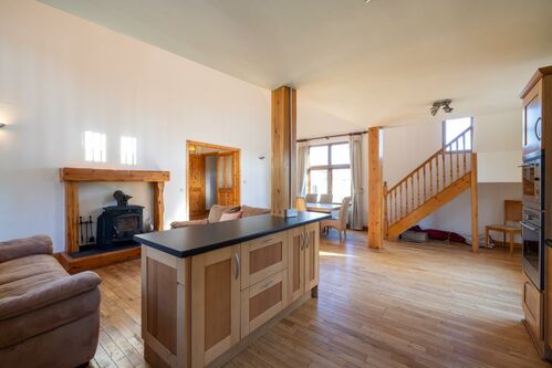 - Open-plan living area with vaulted ceiling and solid fuel stove