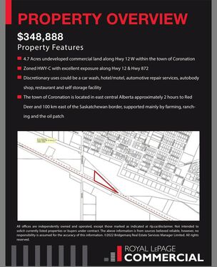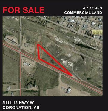 An excellent opportunity to acquire 4.7 acres of undeveloped commercial land strategically located along Highway 12 West within the Town of Coronation, Alberta. This highly visible parcel benefits from exceptional frontage and exposure at the intersection of Highway 12 and Highway 872, making it one of the most prominent commercial sites in the community.