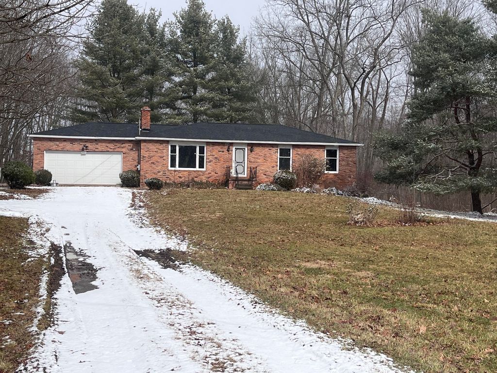 Beautiful green 2-acre lot with trees and a long private driveway that leads to a 2-car garage. New roof and electric panel! This 3-bedroom, 2-bath house with a brick fireplace in the living room is 1,344 square feet with a large basement. Laundry is located in the basement!