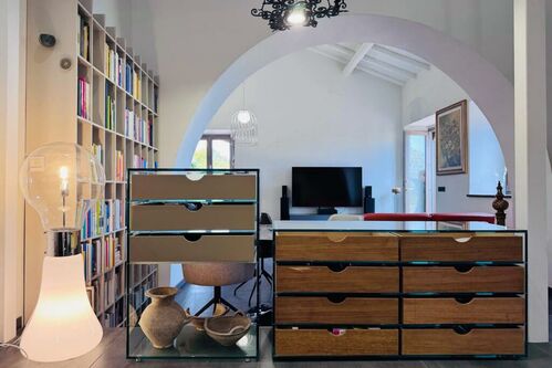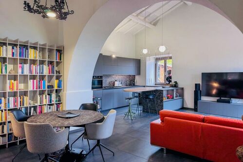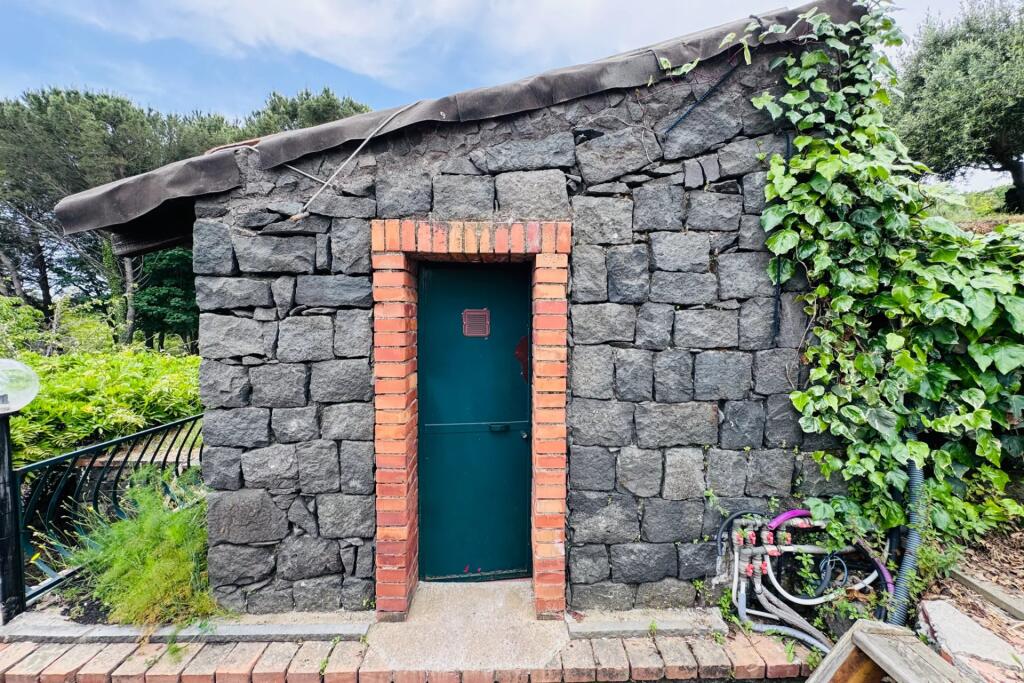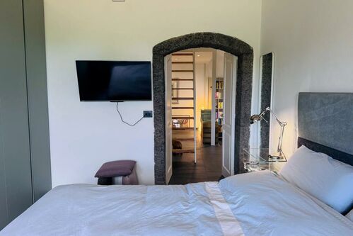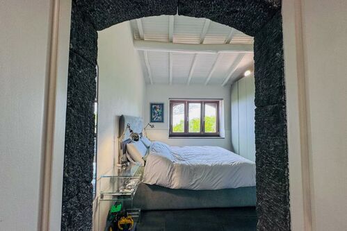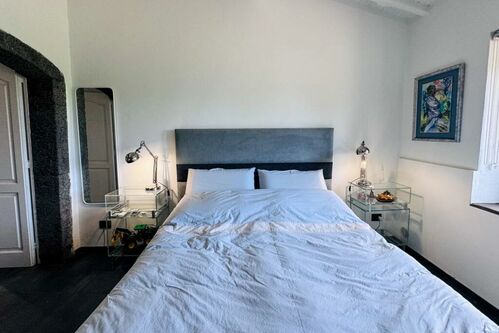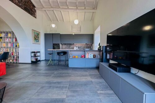 This historic stone villa has been lovingly renovated to blend its original character with modern amenities. The thick, volcanic stone walls tell tales of the past, while the new roof and open-plan interior speak to contemporary living. Large windows flood the space with natural light, creating a warm and inviting atmosphere.