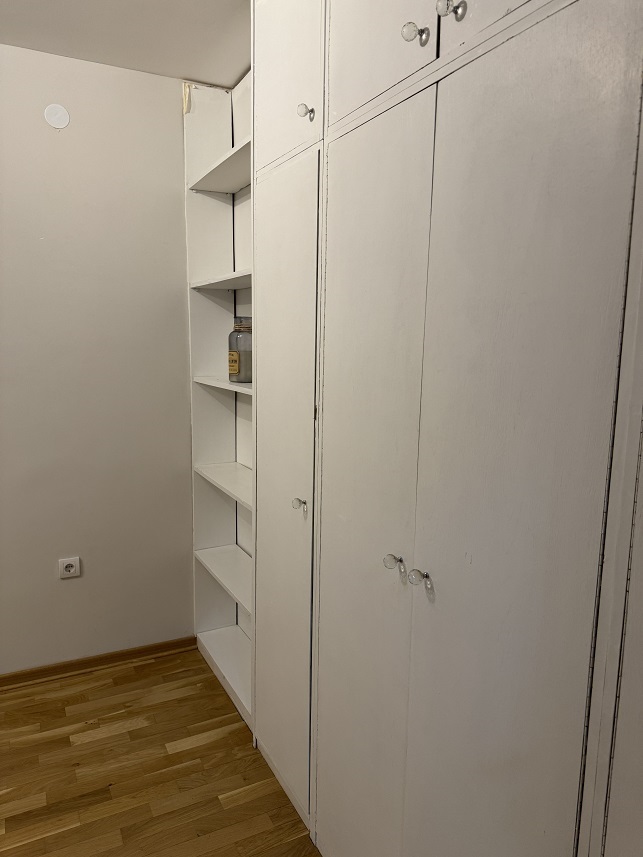 The apartment has built-in wardrobes up to the ceiling, with deep and wide shelves and hanging parts: