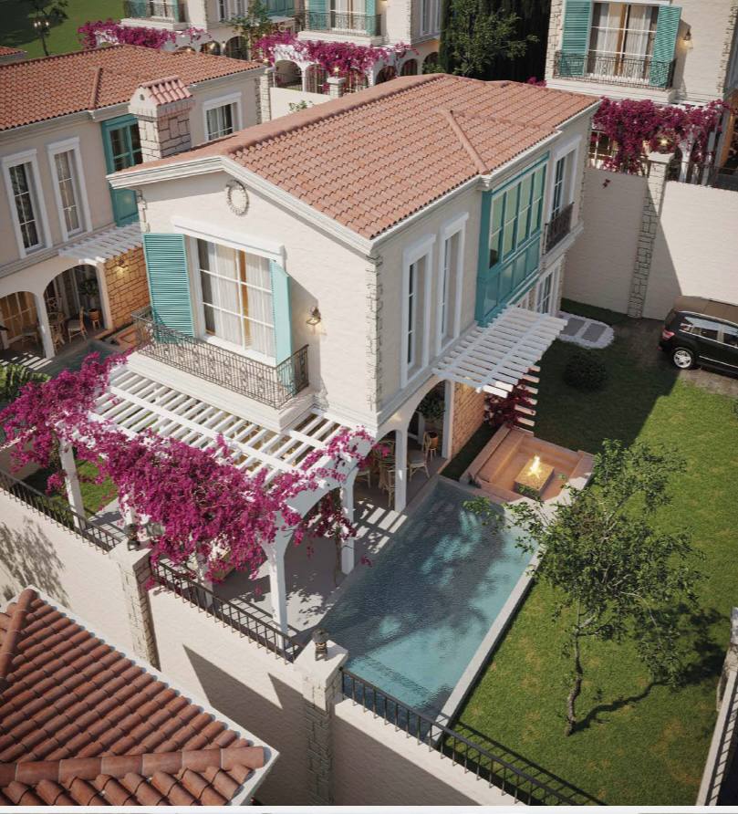 • Territory: Private pool, landscape design (cypresses, flowering vines), recreation area with open fire.