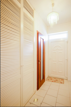 A hallway on the left leads to two cozy bedrooms and a bathroom equipped with a bathtub.