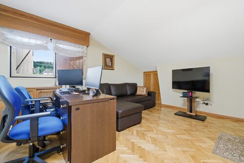 Large living room with professional office area
