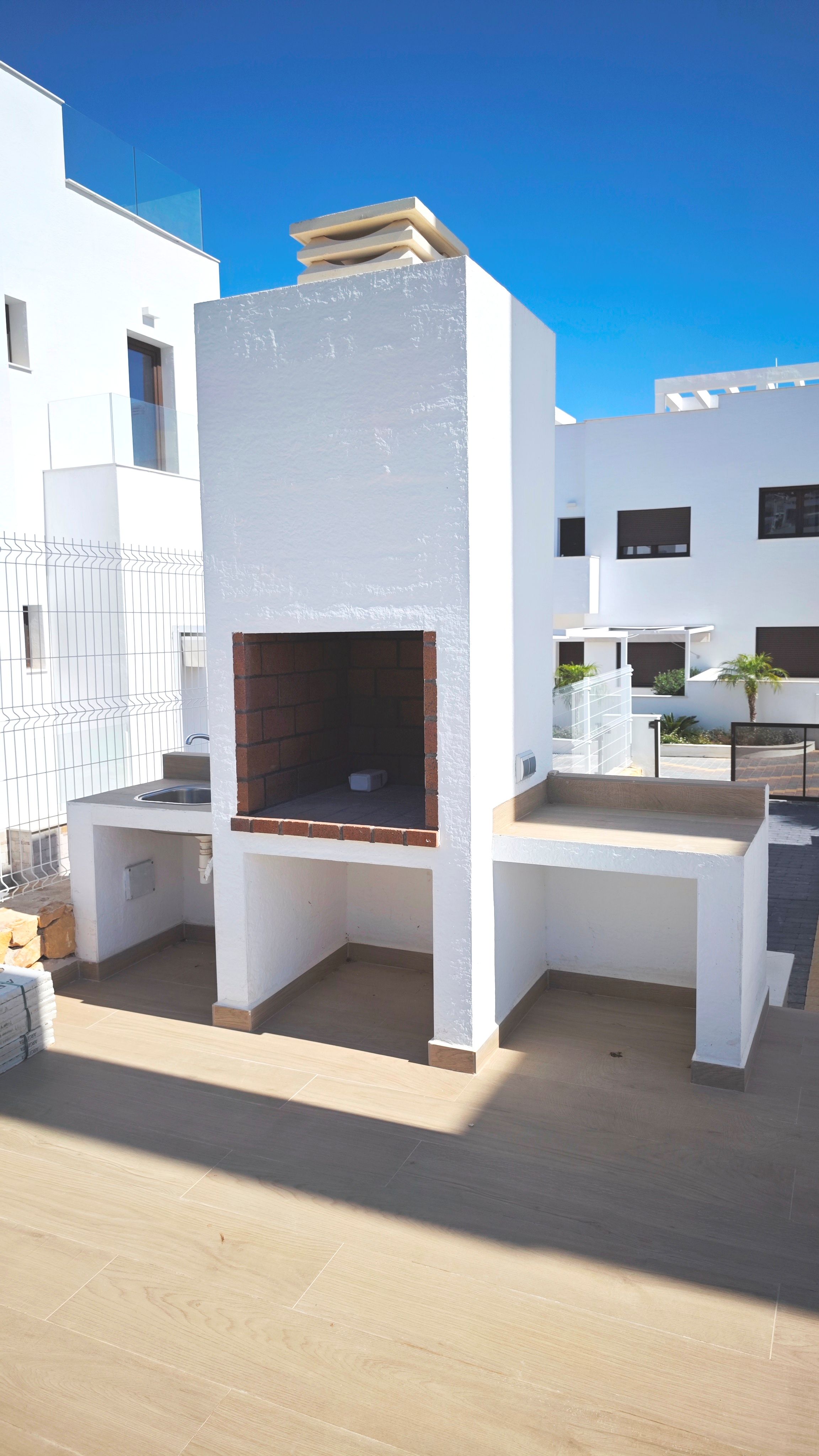 The villa was built in 2023–2024 and sits on a 595 m² plot with a total built area of 320 m². It features 4 bedrooms, 3 bathrooms, two spacious living areas, a fully equipped kitchen and two terraces with open views.