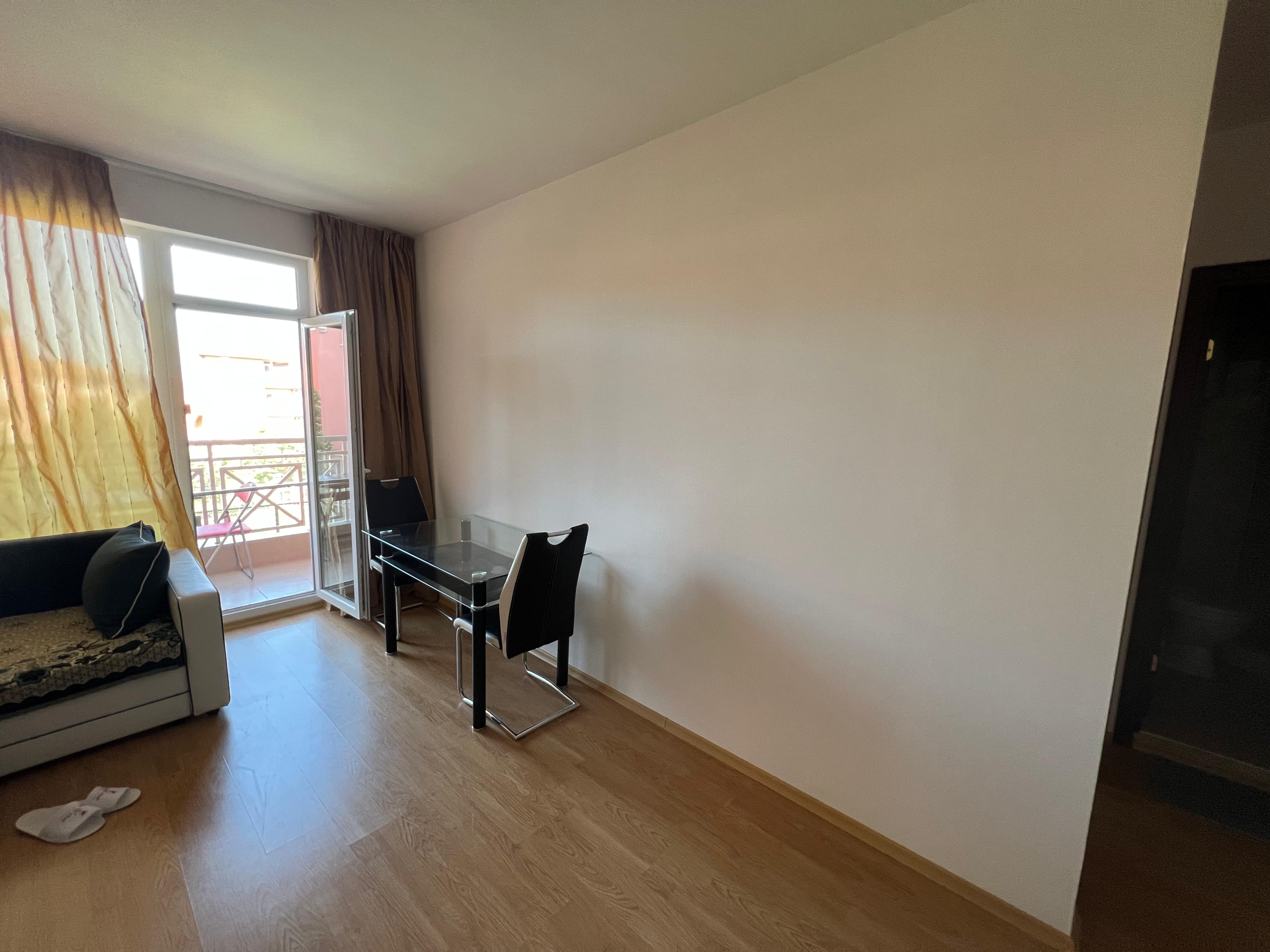 The apartment is in excellent condition and fully ready for immediate move-in. It consists of a living room with a separate kitchenette, a small dining area and living space, a cozy bedroom, a bathroom with toilet, and a balcony with a beautiful view of the green area of the complex and the tennis court.