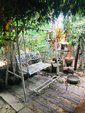 Garden with a cabana and relaxing swing