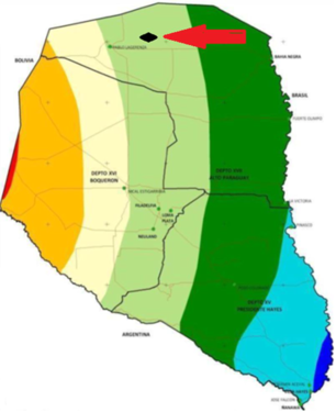 Located between the Agua Dulce and Pablo Lagerenza forts, Bahía Negra district, Alto Paraguay Department. 280 km from Mariscal Estigarribia. 370 km from Loma Plata. 800 km from Asunción.