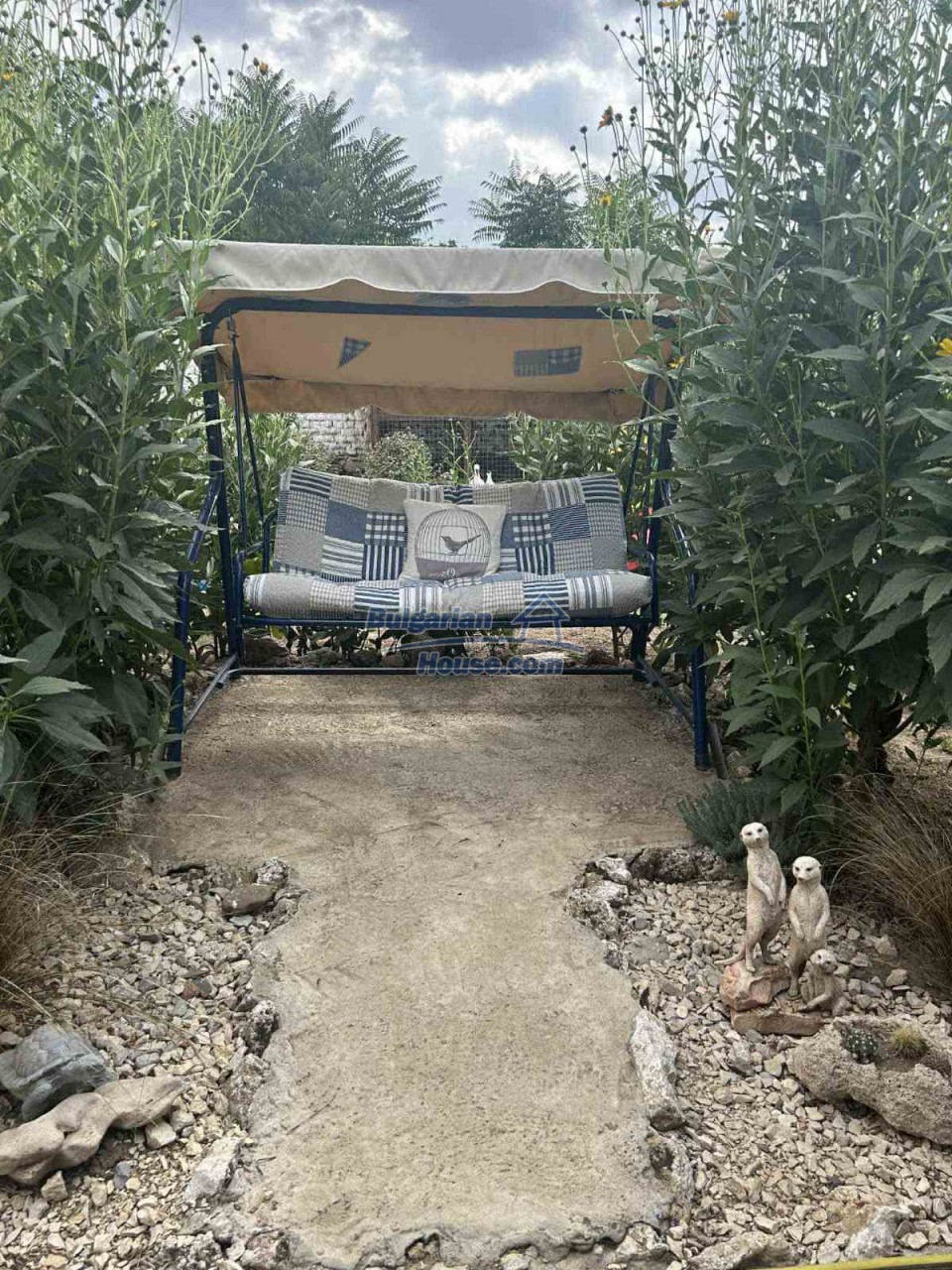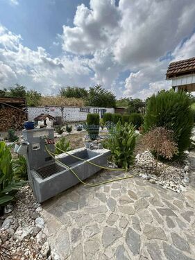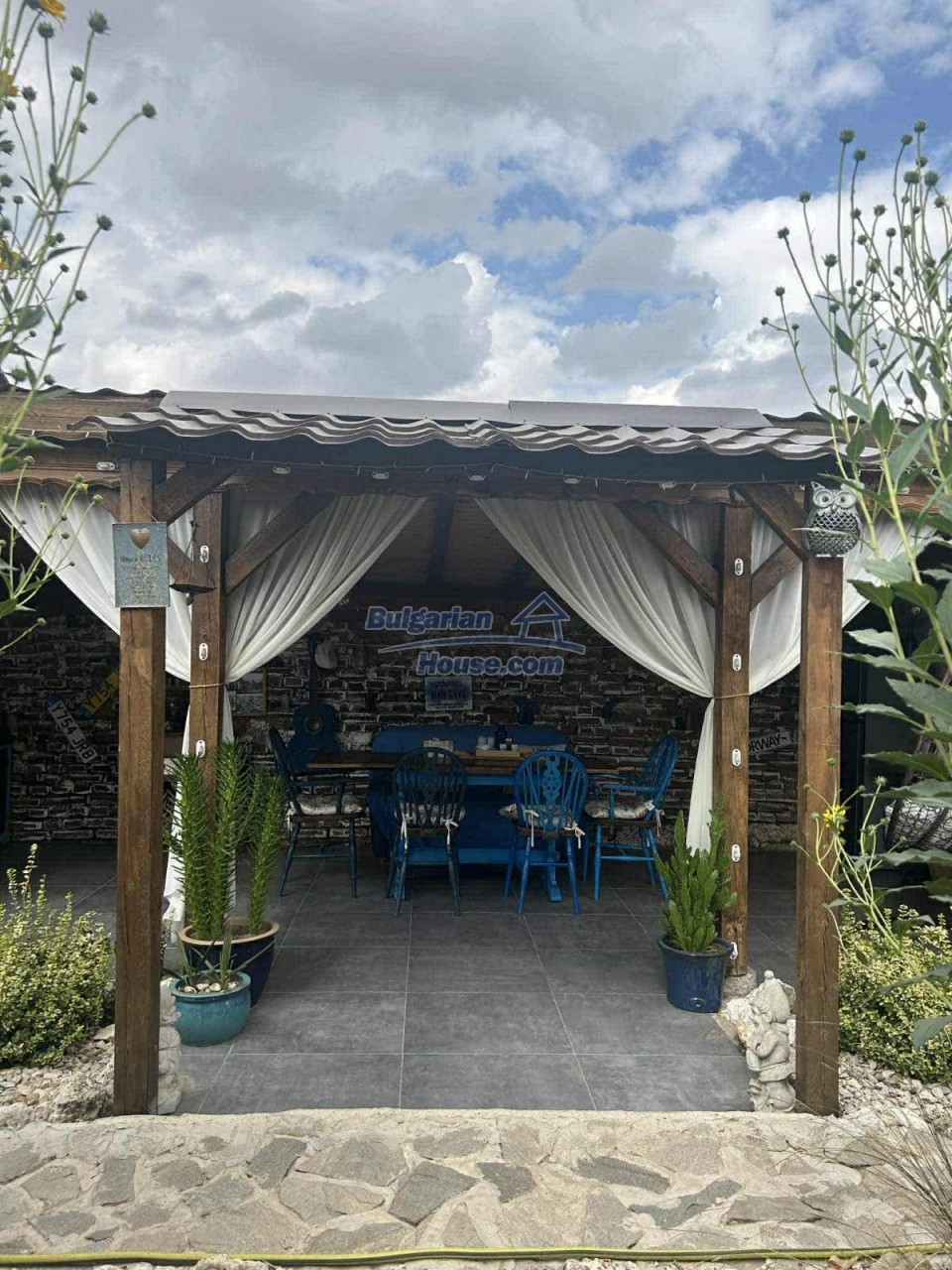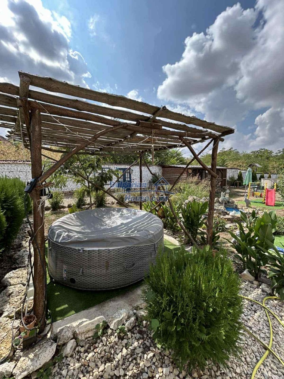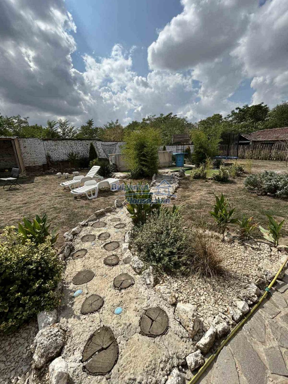 The plot spans 1,124 sq.m., beautifully landscaped with flowers, shrubs, and mature trees. A significant asset is the spacious farm building, currently used for storage but easily convertible into a guesthouse. There's also a dedicated wood storage shed and even a custom-built cage for exotic birds.
