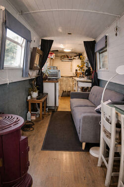 Saloon: A bright and airy living space with a solid wood floor, built-in storage, and plenty of room for a log burner. Currently heated by two gas heaters, this area could easily be transformed into a warm and welcoming living area.