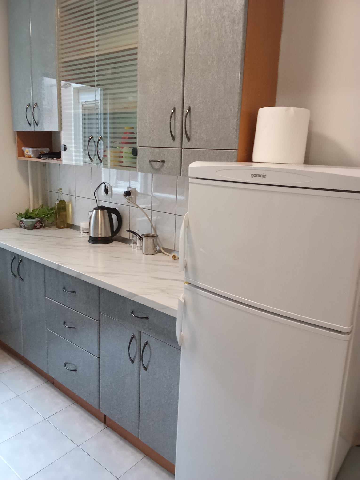The apartment is located on the high ground floor, elevated 1 metre in relation to the terrain. Rooms oriented on cooling North, with kid's room and kitchen on South. Venetian mirror windows with blinds.