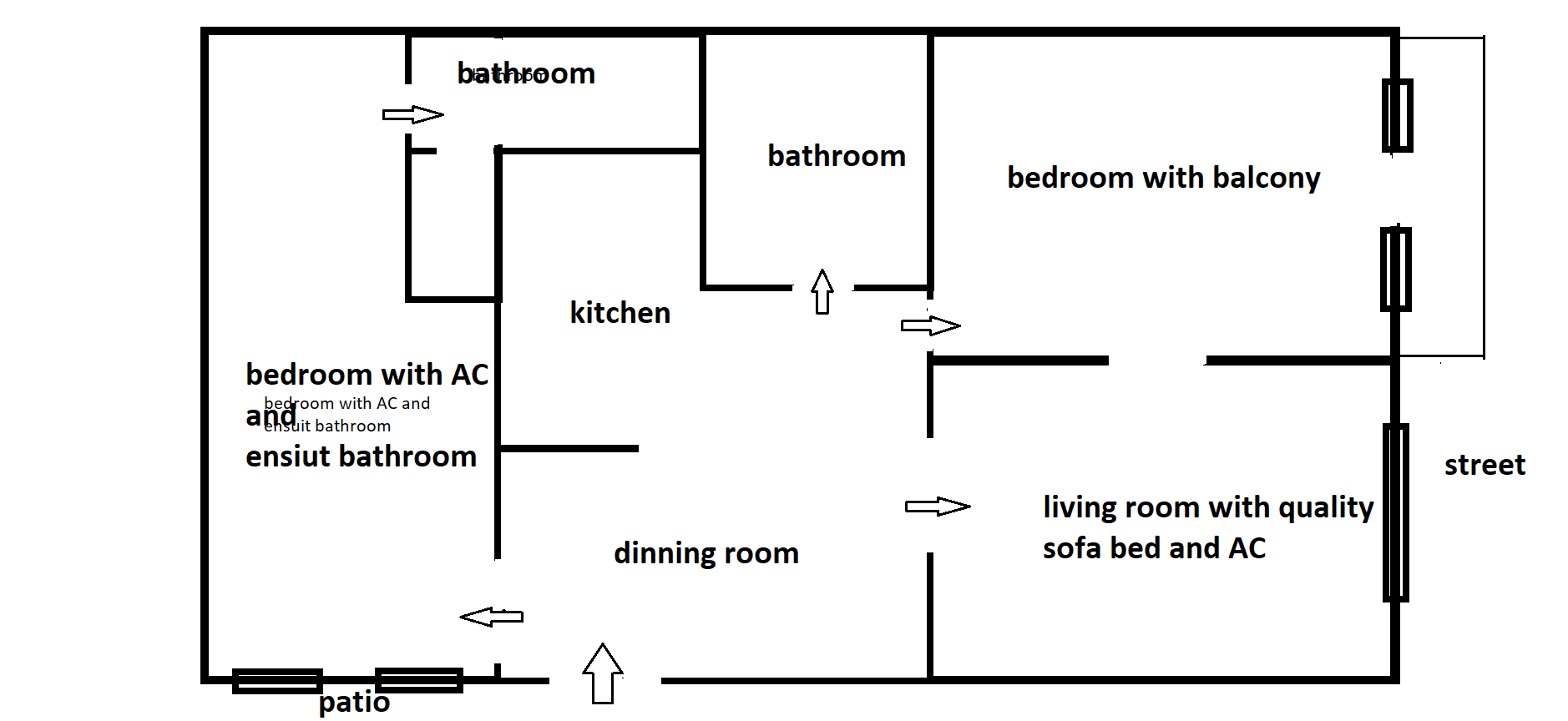 The 83 mn2 inculdes 3 nice size of rooms between 15- 22 mn2 , all rooms has separated , individual entarnce . There are 2 full bathrooms , one ensuit and connected to the courtyard bedroom (walk in rain shower , toilet , sink ) . The other bathroom acsess from the dinning room , it has bathtub with shower , sink and toilet too .