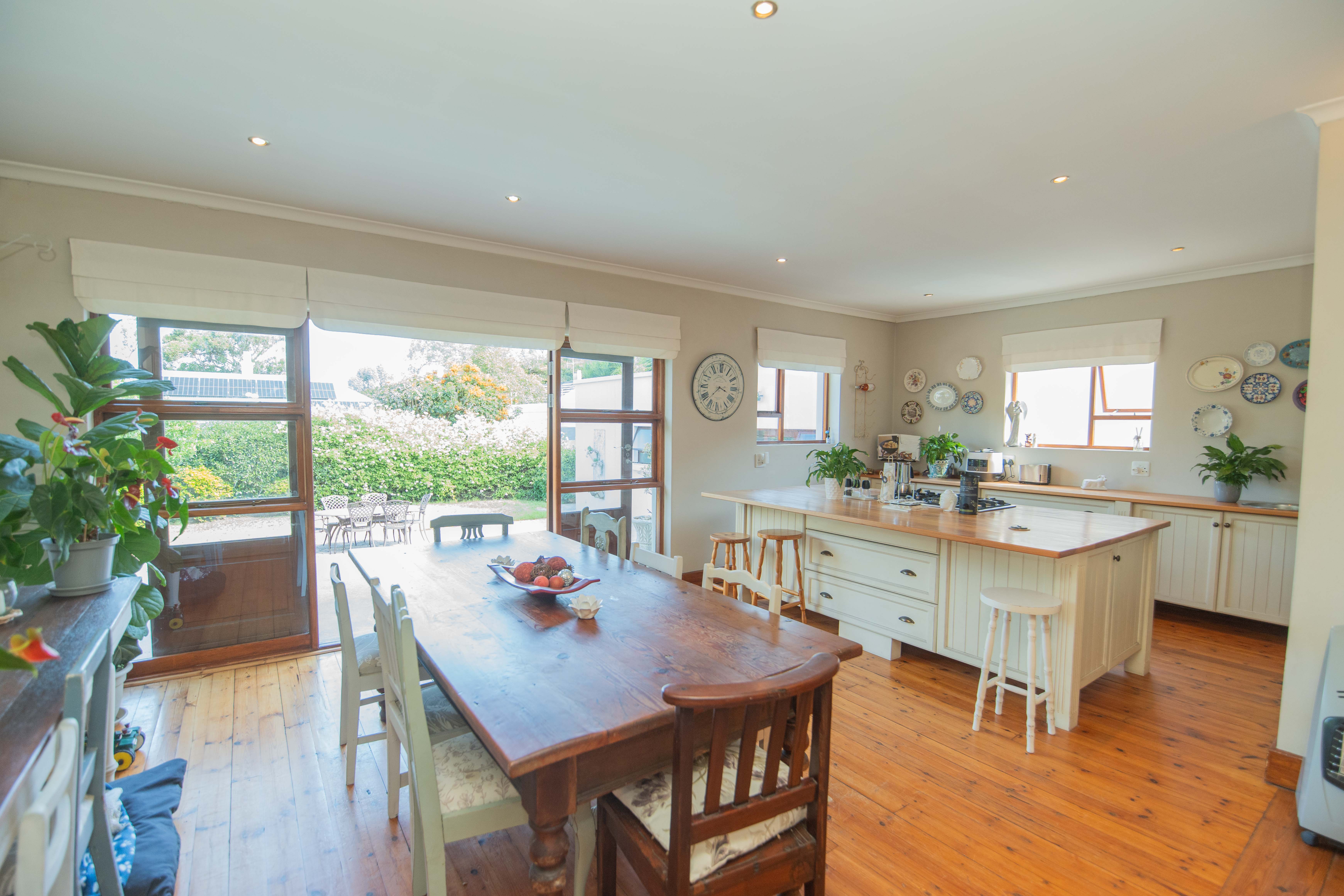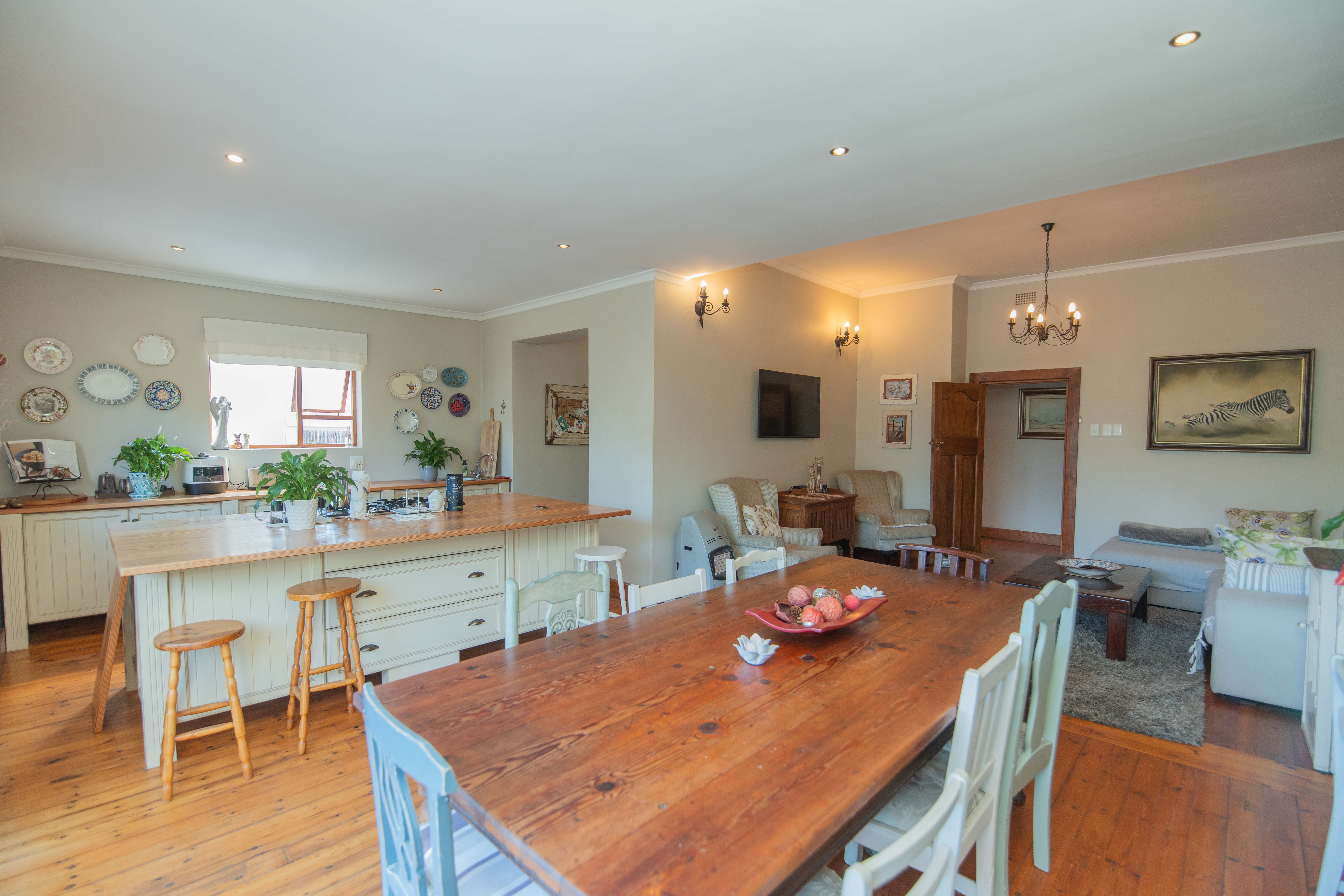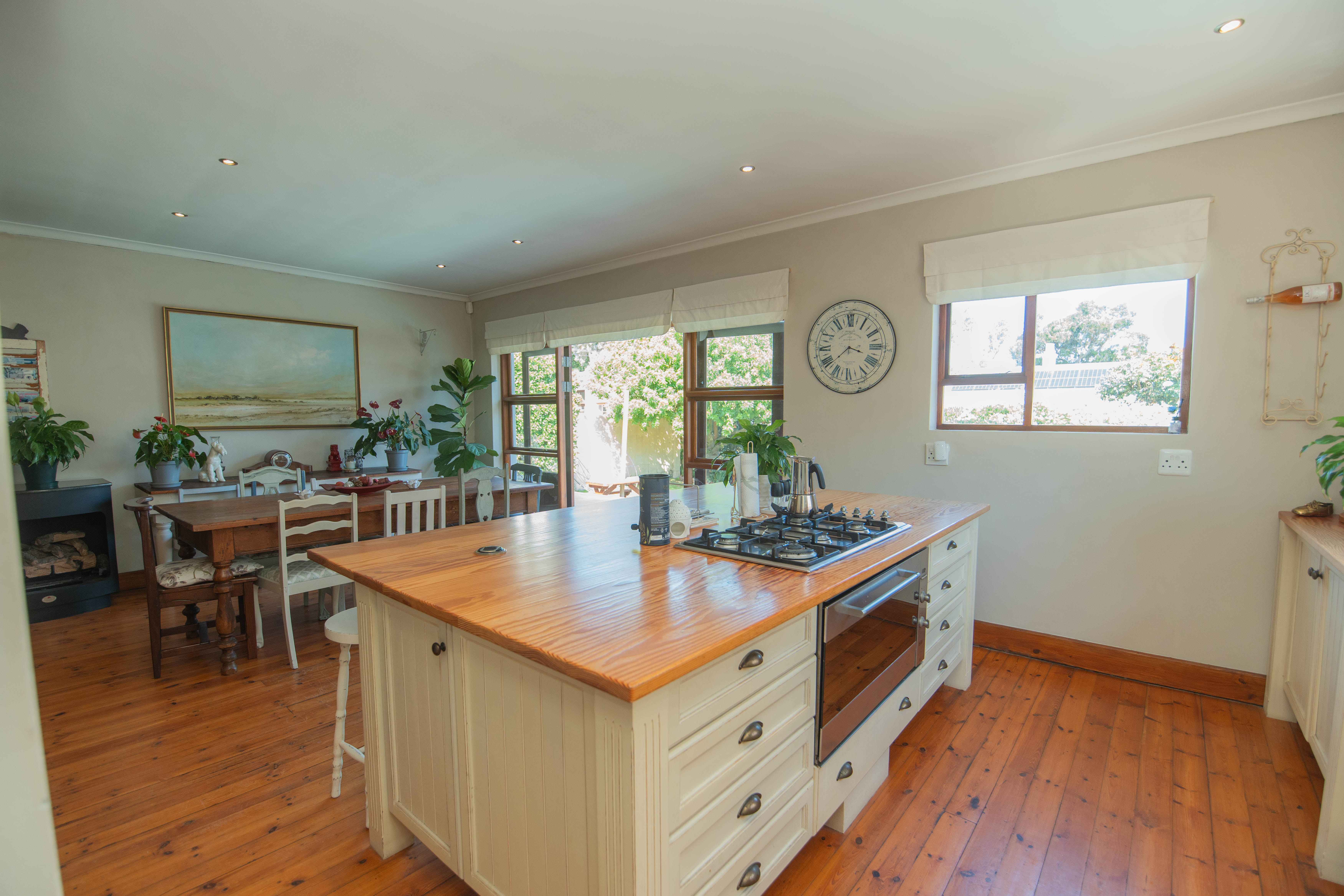 Quality Country classic kitchen: DeLonghi Gas stove, Meranti cupboards and Oregon pine countertops. Open plan to the cozy lounge and dining area with gas fireplace (Home Fires). Wooden doors opens to the "patio" and garden. Separate scullery and laundry.