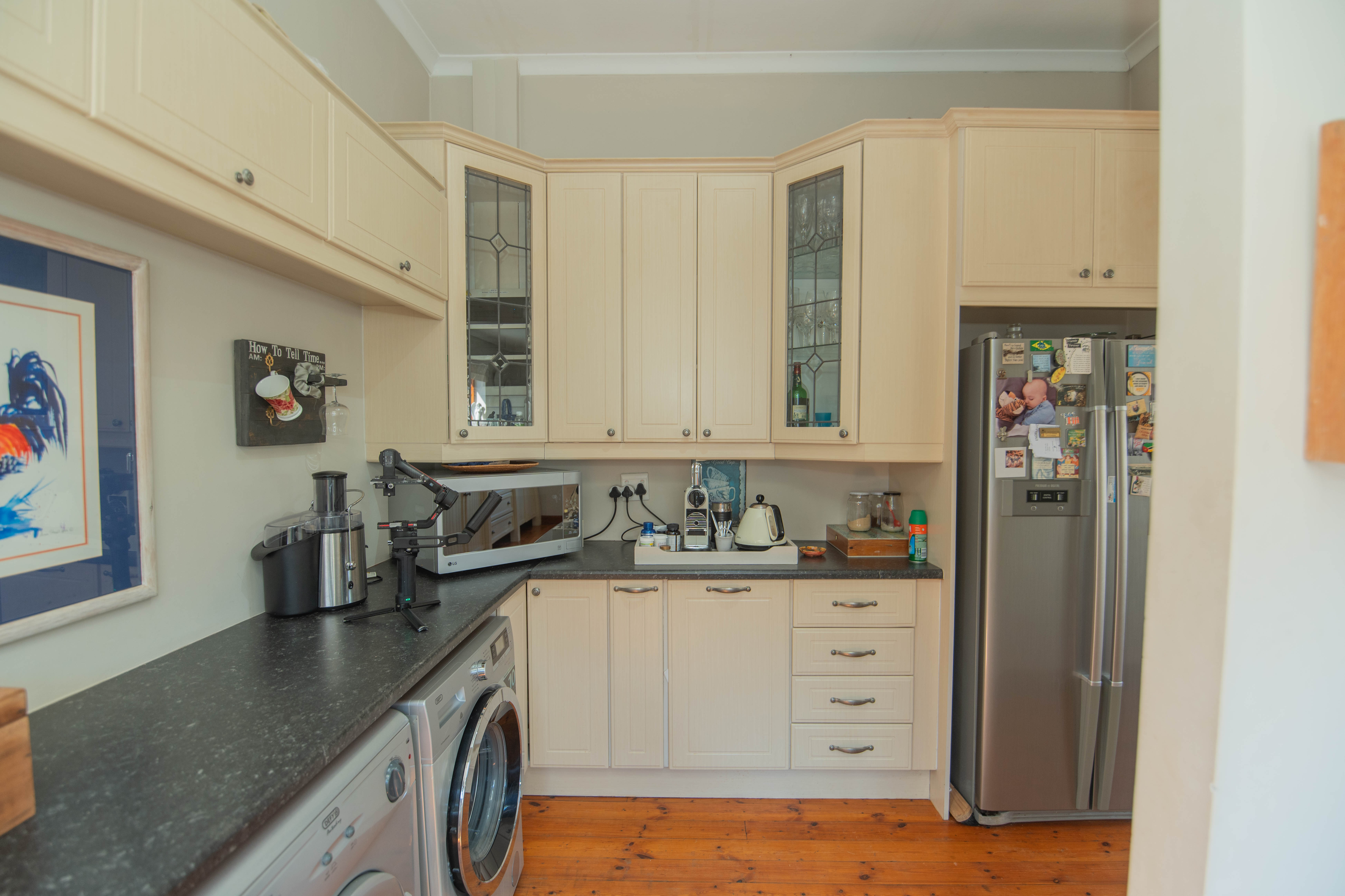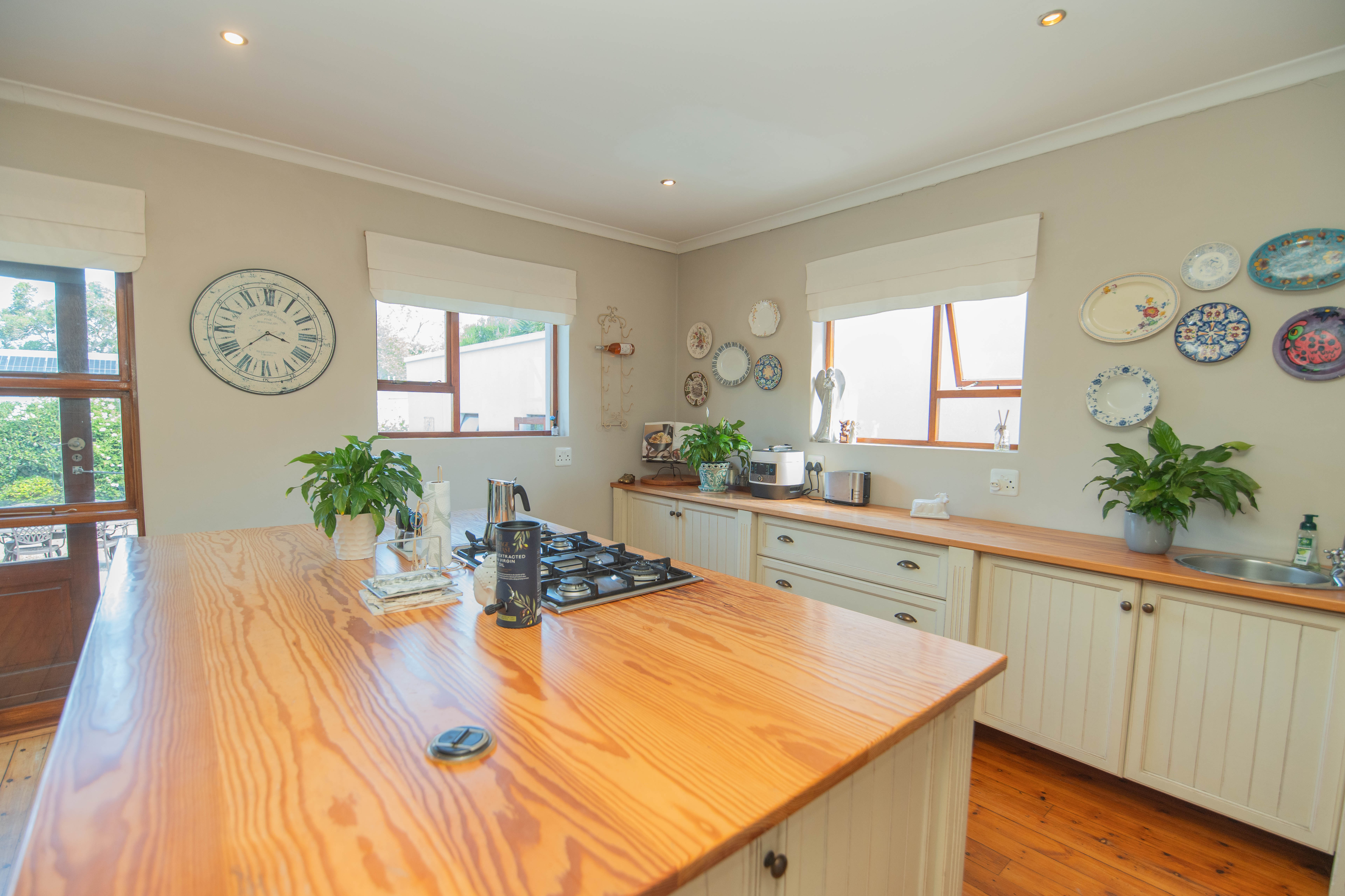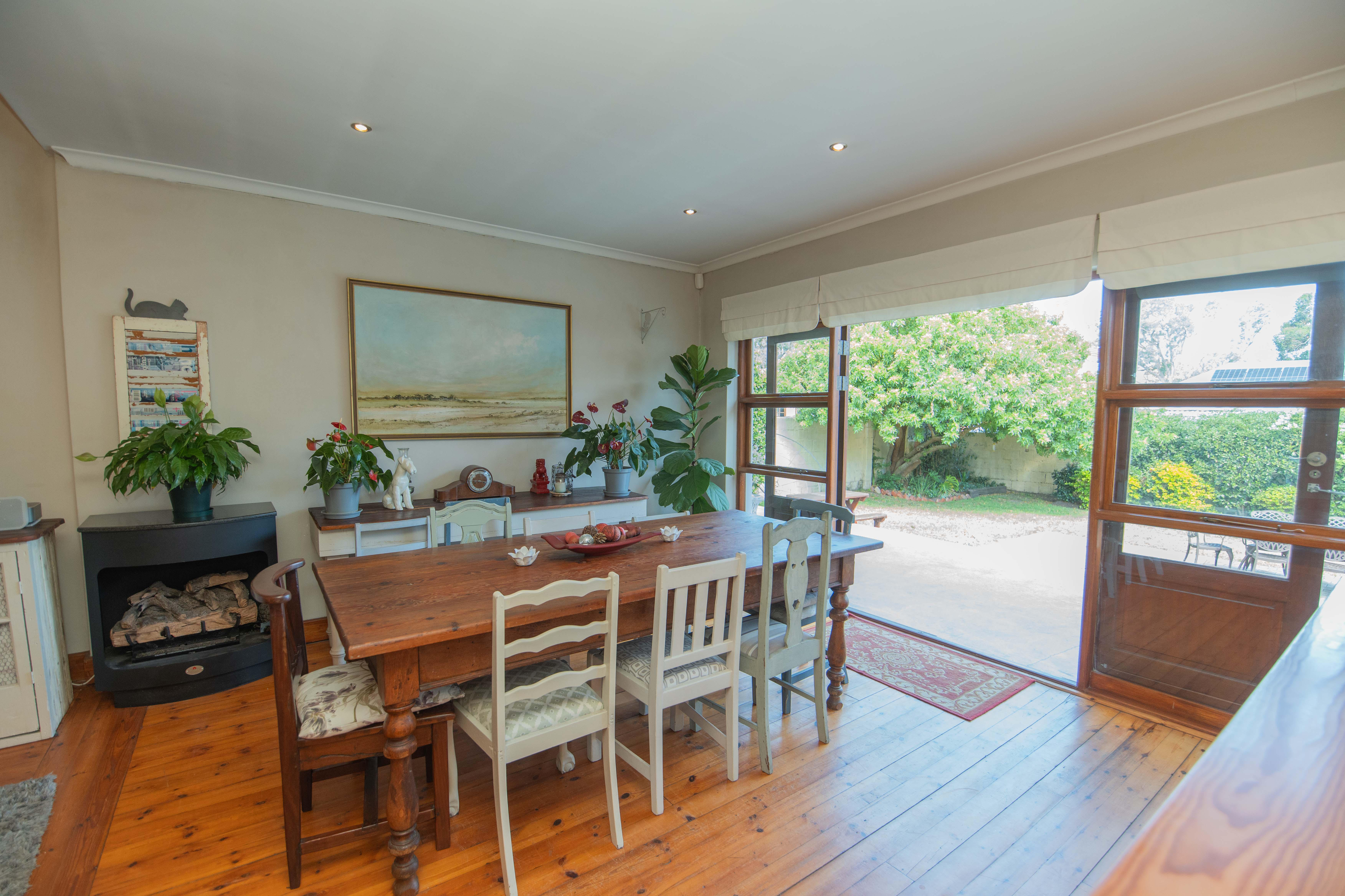 Quality Country classic kitchen: DeLonghi Gas stove, Meranti cupboards and Oregon pine countertops. Open plan to the cozy lounge and dining area with gas fireplace (Home Fires). Wooden doors opens to the "patio" and garden. Separate scullery and laundry.