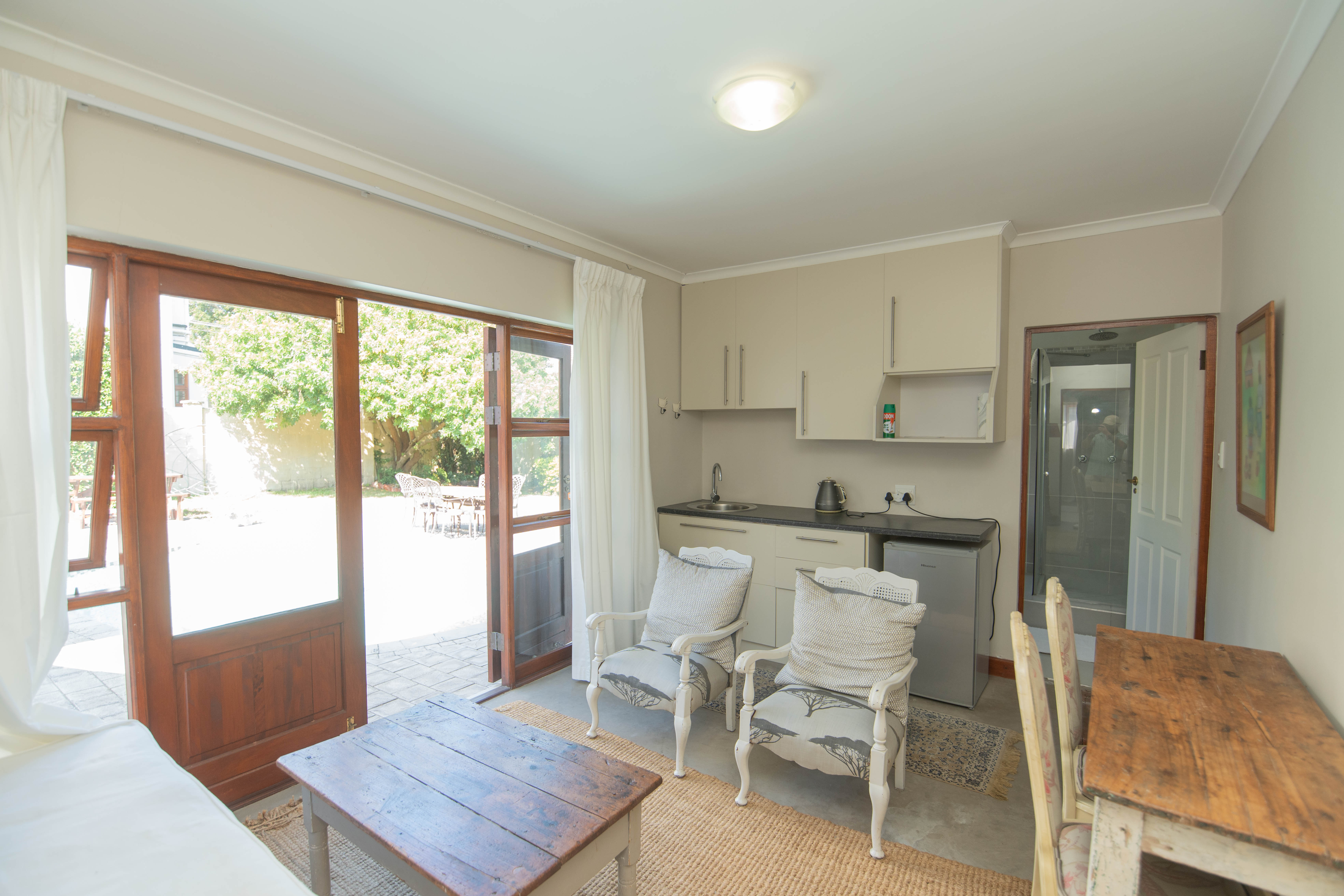 - Separate one bedroom cottage with full modern bathroom, kitchenette and small lounge area. Modern screeded flooring.