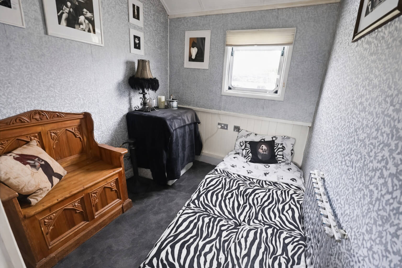 The guest bedroom comfortably fits a small double or sofa bed and includes built-in storage, making it ideal as a second bedroom or home office.