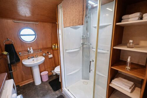 The Falcon is a fine example of a residential widebeam narrowboat, offering comfortable, fully furnished accommodation on a secure residential mooring in a highly convenient location. With classic fittings, excellent heating, and outdoor space, she represents a fantastic opportunity for those seeking a well-presented floating home.