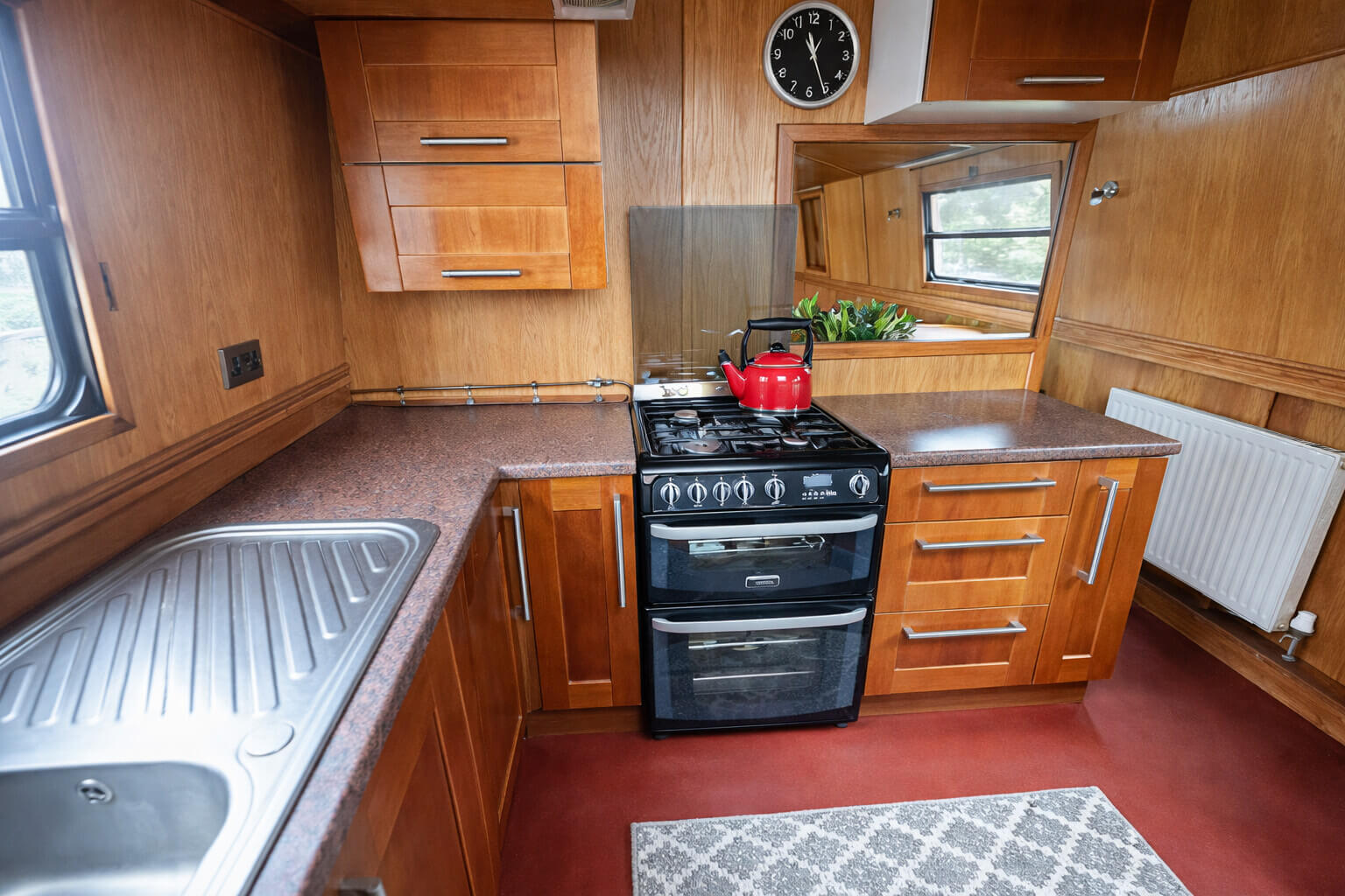 The well-appointed galley kitchen offers ample storage and work surfaces and is fully equipped with a fridge, freezer, and LPG oven and hob.