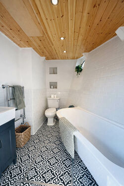Forward from the living area is a double cabin, currently used as a nursery, and a large family bathroom featuring a full-sized bath with shower attachment, hand basin, heated towel rail, and toilet.