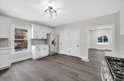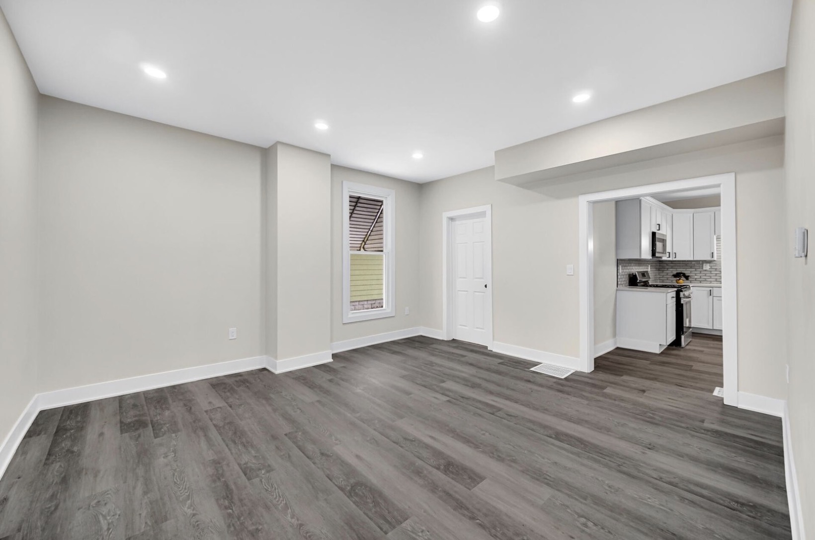 The main level features a bright and inviting living room complete with recessed lighting, updated flooring, and a large picture window that fills the space with natural light. The modern kitchen is thoughtfully designed with granite countertops, abundant cabinetry, and newer stainless steel appliances, making it ideal for both daily living and entertaining.