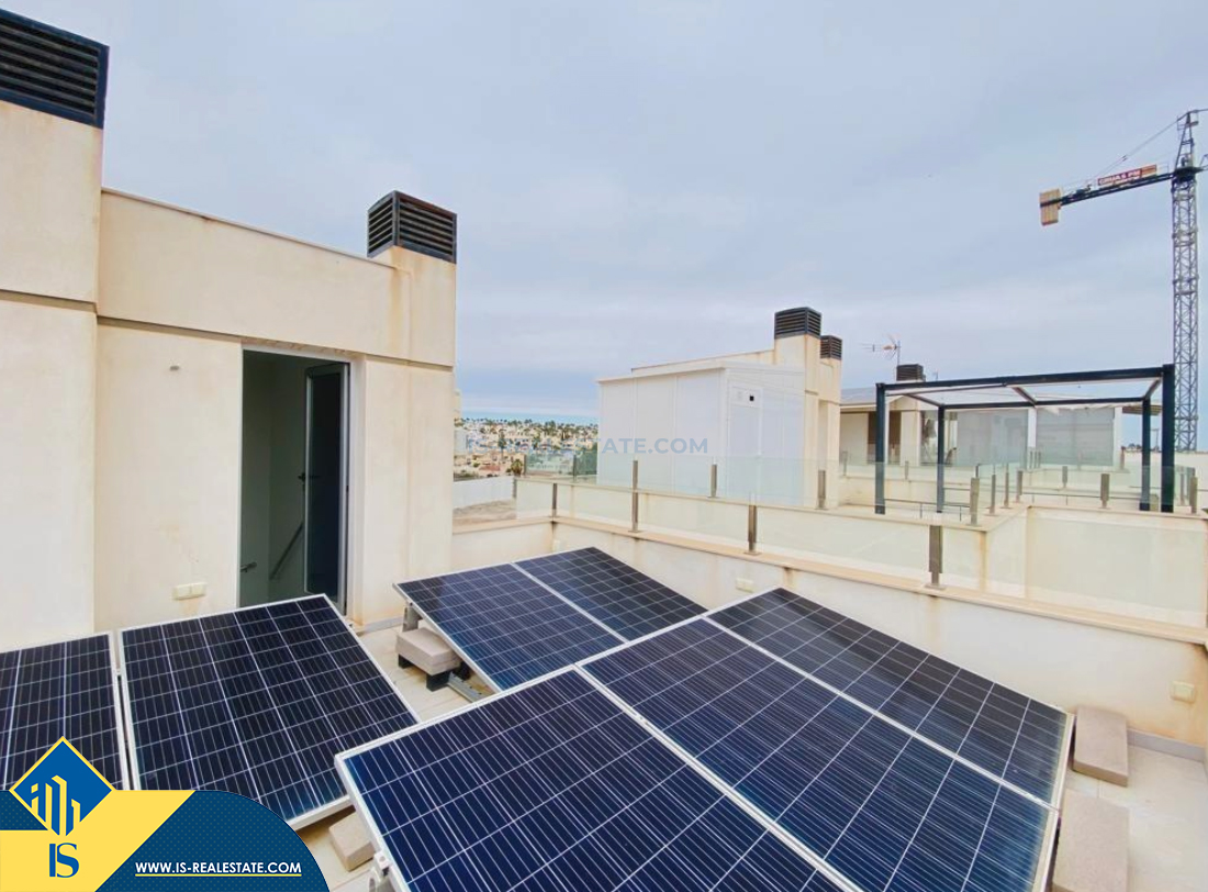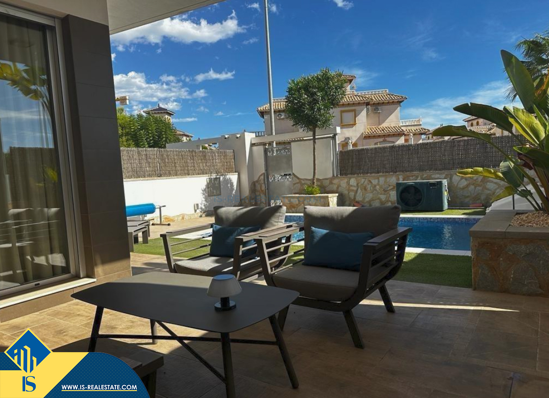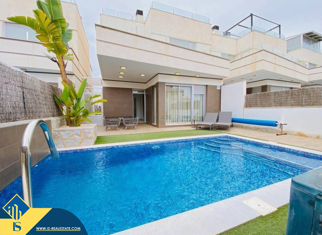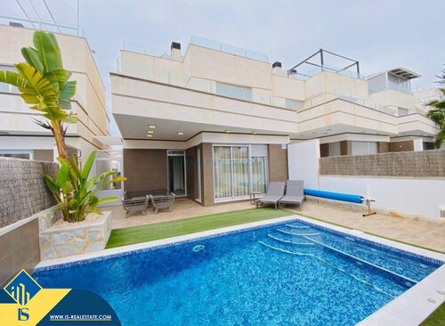 4-room villa of 2016 construction, in the province of Alicante, Orihuela Costa, Spain, 2.2 kilometres to the sea, total surface of 257 m², 54 kilometres to Alicante airport. The property has a courtyard, private swimming pool, parking space for a vehicle. Near the property there are shops, restaurants, bus stops, children's areas, petrol stations, green areas, cafes, hospital, tennis courts, supermarket