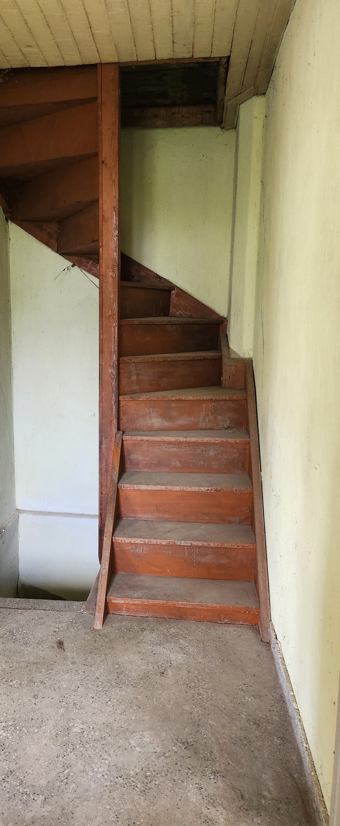 Attic Space Additional storage or potential for conversion. Internal wooden spiral staircase.
